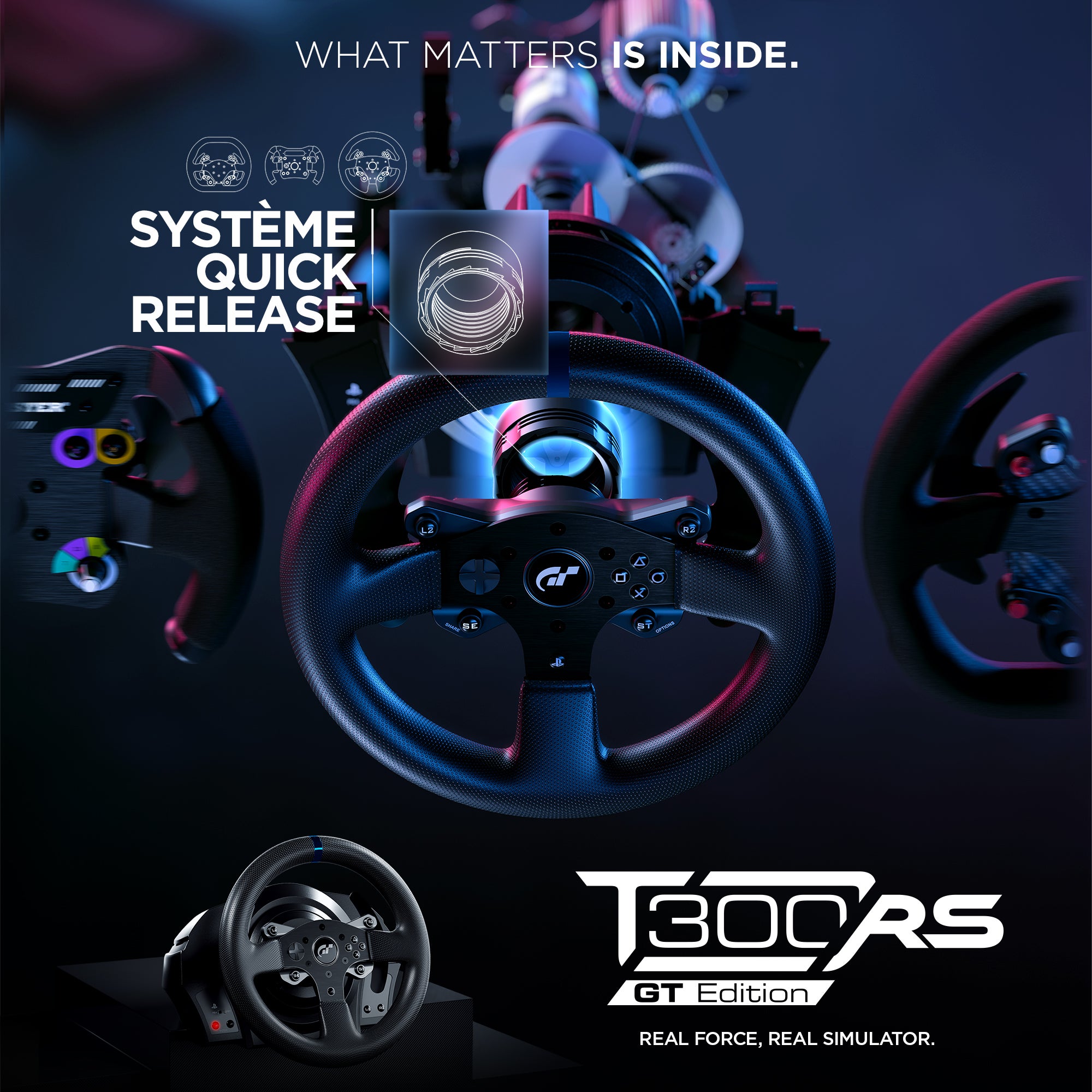 SIMPLE WHEEL CHANGING SYSTEM: All products in the T300RS series (T300RS, T300RS GT and T300 Ferrari Integral Racing Wheel Alcantara Edition) feature a quick and easy wheel changing system, allowing users to enjoy racing using different Thrustmaster wheels.