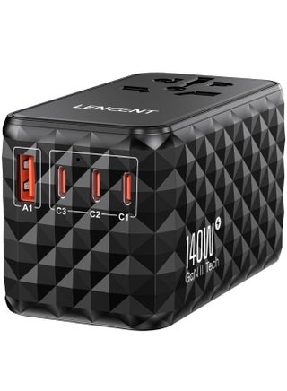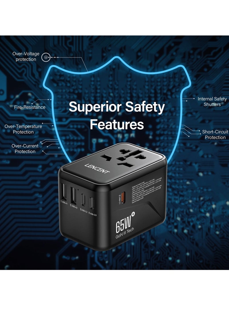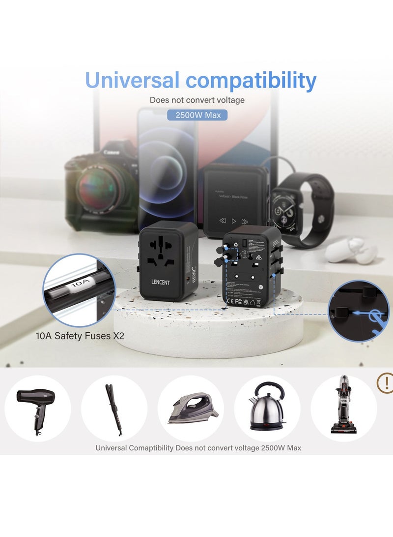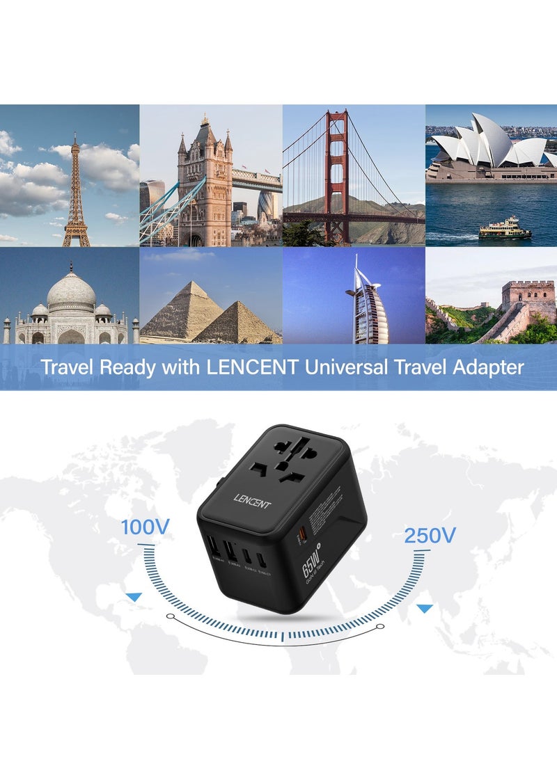 The LENCENT travel adapter seamlessly plugs into a variety of international sockets, allowing you to easily charge your devices in multiple countries. Equipped with 2 USB ports and 3 Type-C adapters. At the same time, it is equipped with 1 Type-C is PD 65W fast charging port, you can charge multiple devices at the same time, perfect for smartphones, tablets, laptops, etc.