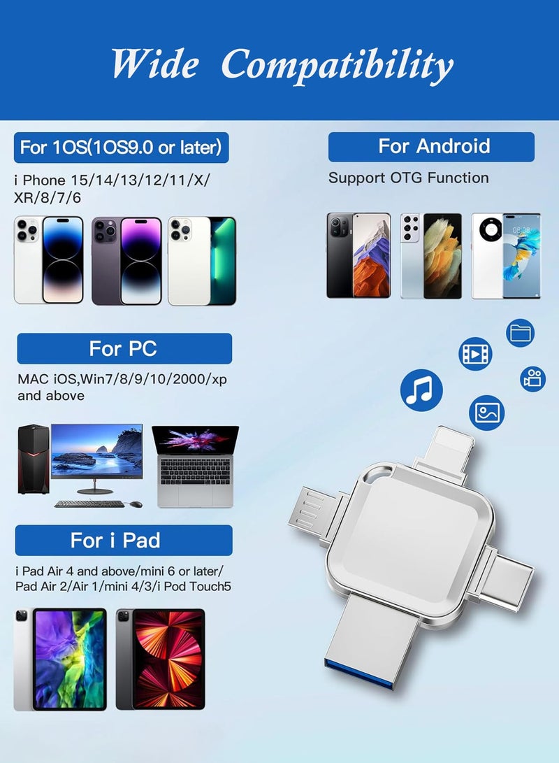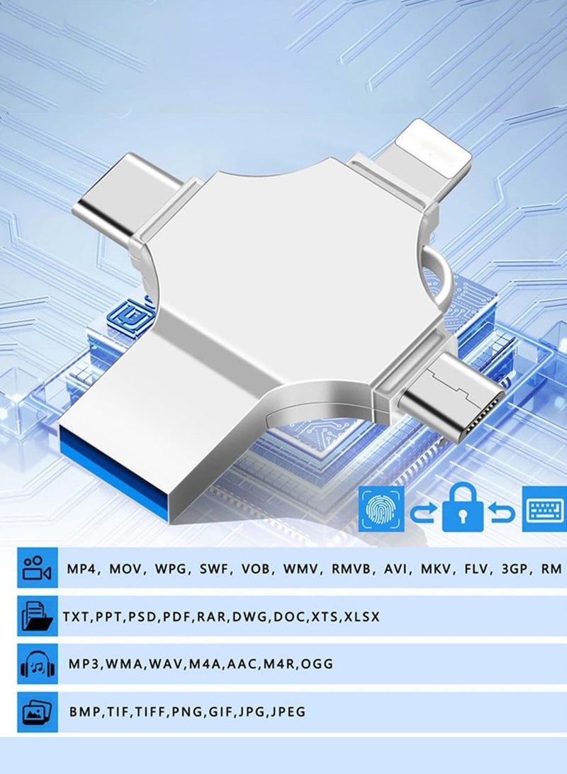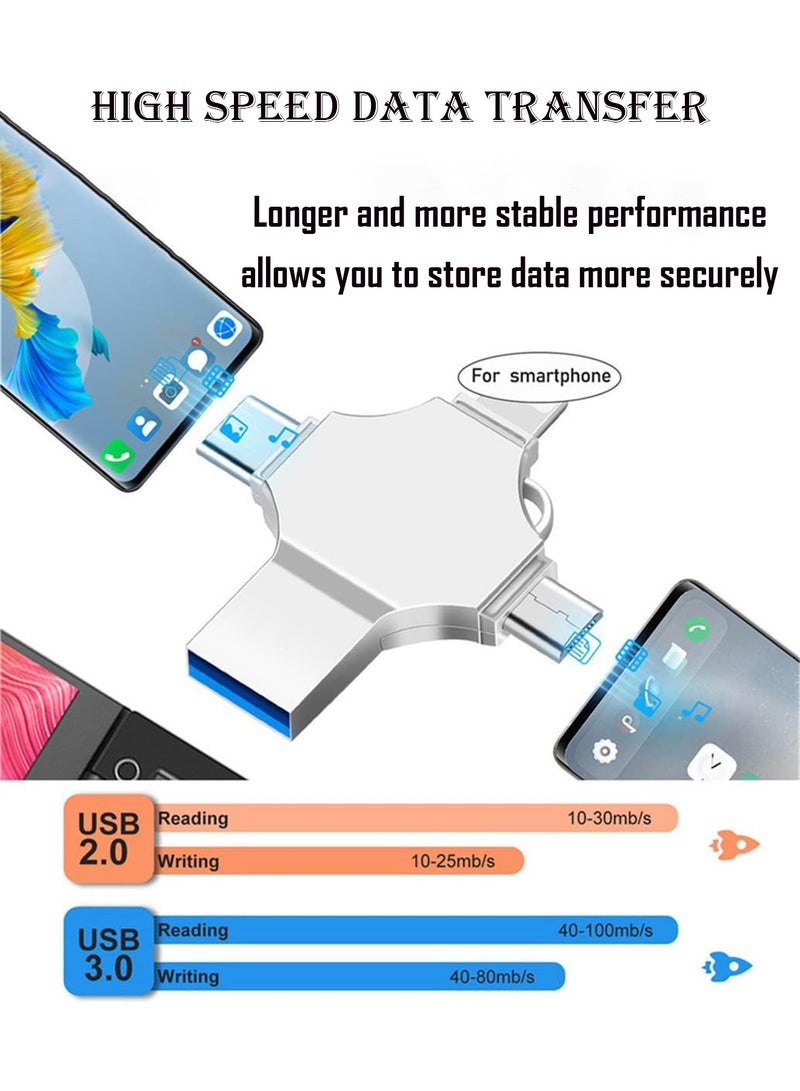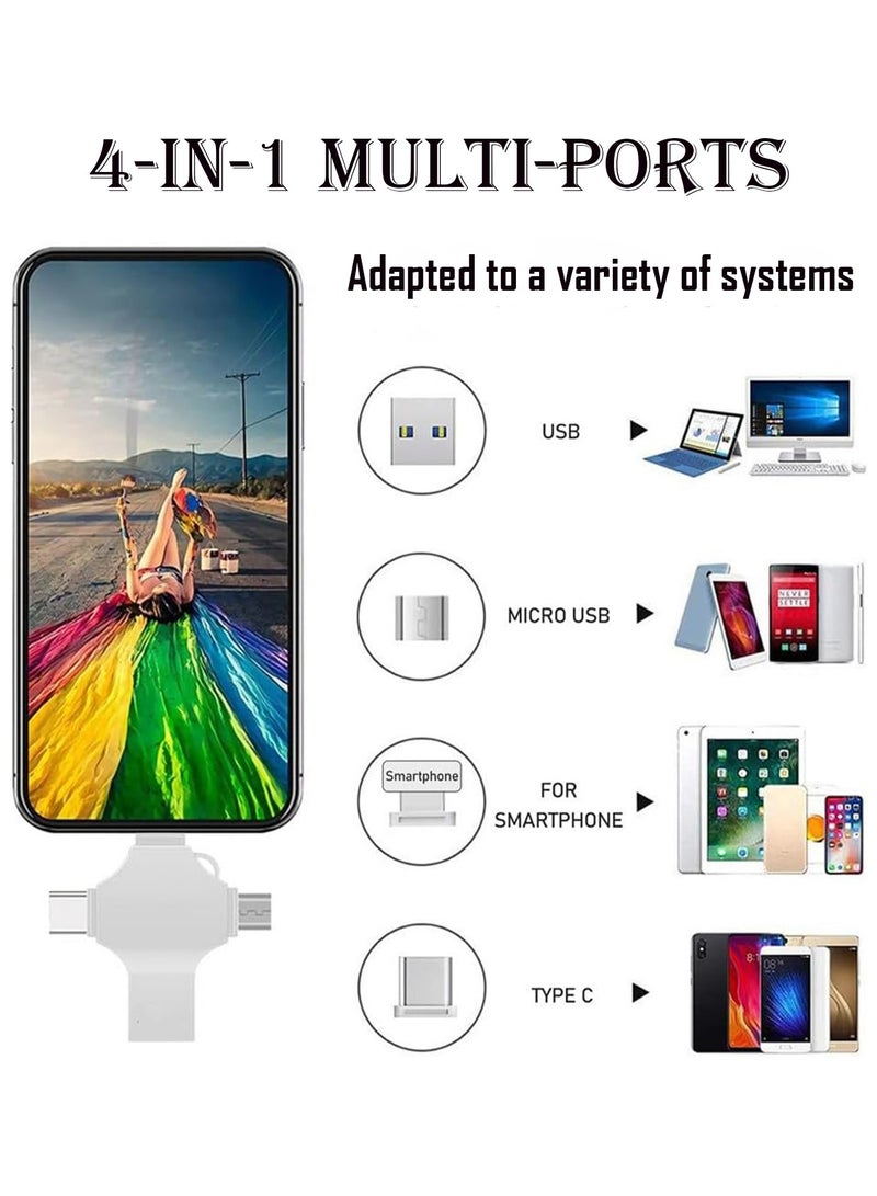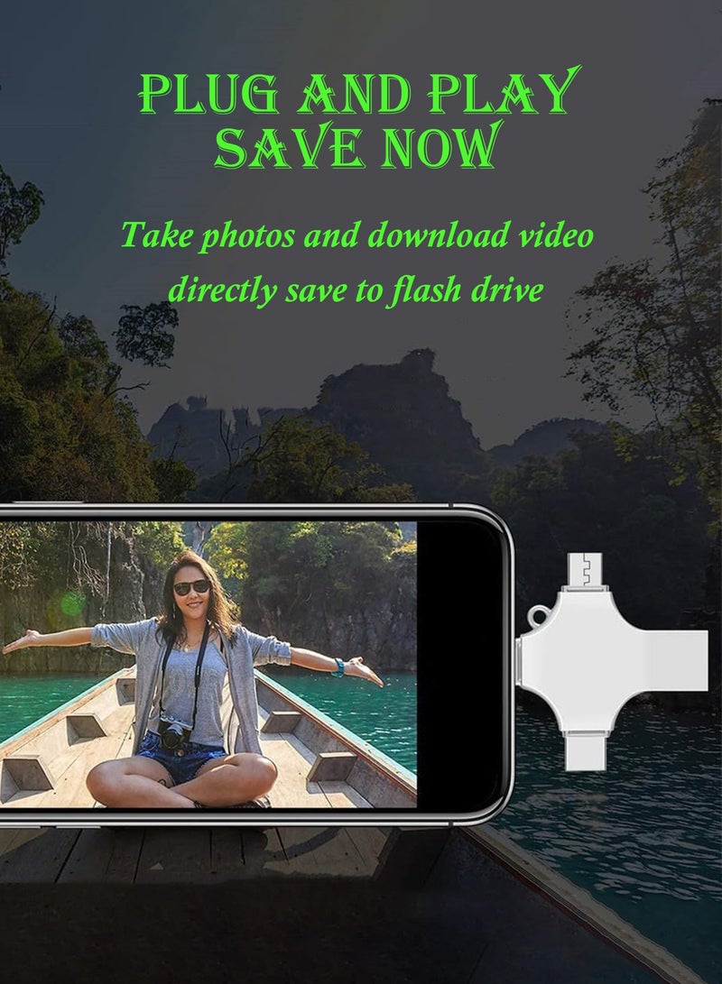 The USB flash drive has a USB/Lightning/Type C/Micro USB 4-in-1 interface, which makes it easier to transfer data between different devices, thus getting rid of the trouble of data cables and allowing you to easily switch storage space. In addition, you can also store the videos, photos or favorite movies you have taken on the photo stick and watch them directly on the 128 GB flash drive. No need to worry about mobile phone storage problems anymore!