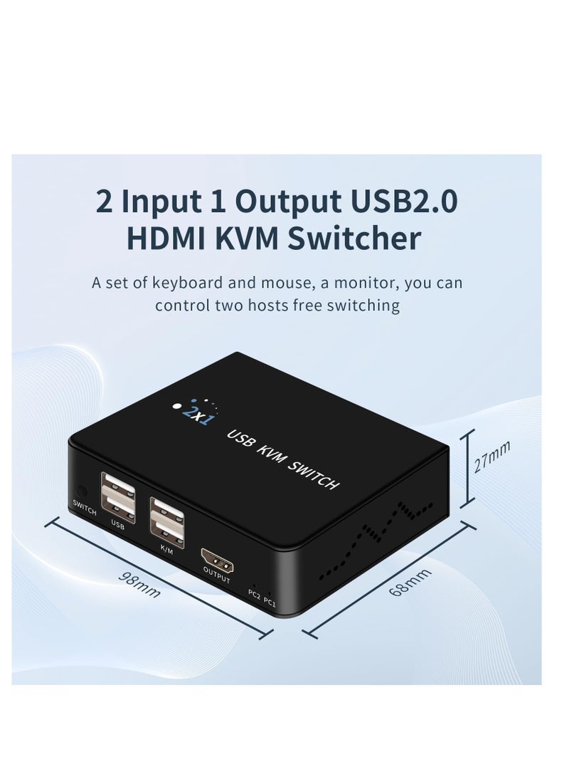 📦 Comprehensive Package & Support: The kit includes a 2*1 HDMI KVM switch, a 1.5m desktop controller, two 1m HDMI cables, two 1m USB cables, a 1m USB power cable (spare), and a user manual.