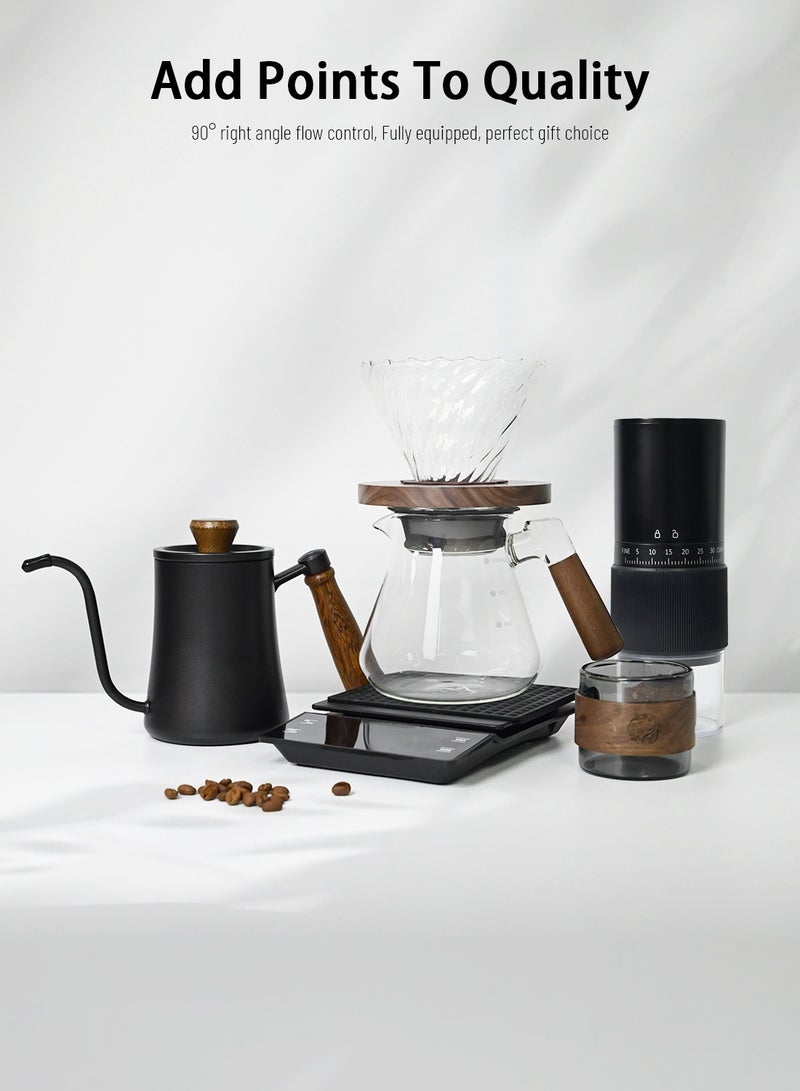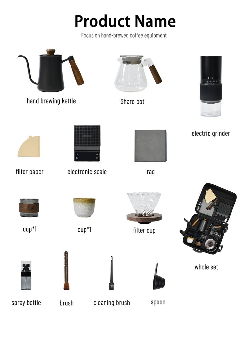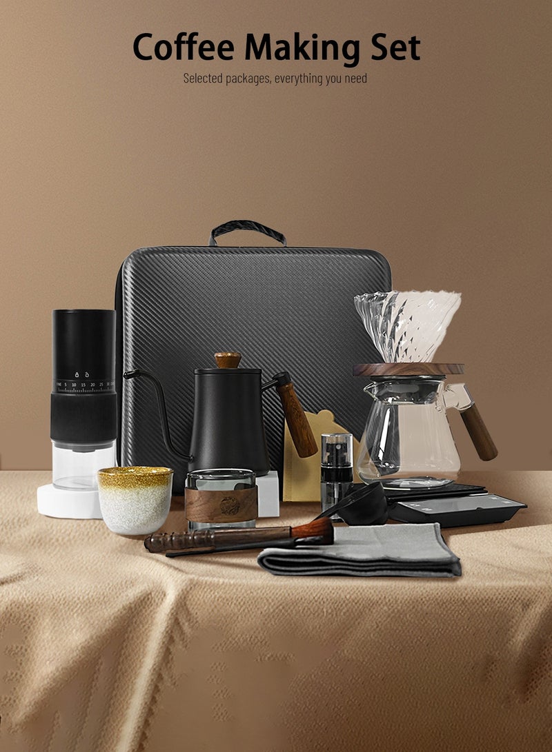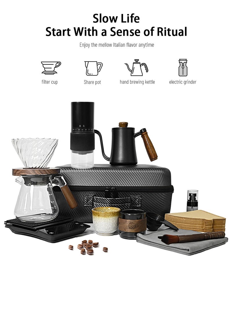 CHOIWIN Complete Bag suitable for travel , travel gift . lightweight and shock resistant,Specialty coffee bag V60 ,Contains: 1. electric grinder 2.glass coffee drip funnel 3.Stainless steel coffee kettle 4.Drip glass jug 5.Glass coffee cup 6.Ceramic coffee cup 7.manual coffee scale for the kitchen 8.Filter paper V60 coffee 9.Double-sided soft towel 10.Coffee grinder cleaning brush 11.coop spoon with scale for coffee beans 12.Spray to moisturize coffee beans and static.