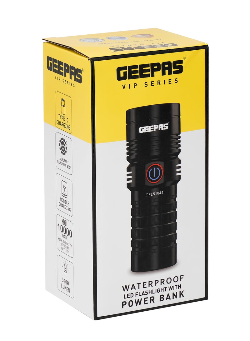 Make your environment more visible. The Geepas waterproof LED flashlight with power bank is a trendy and modern flashlight that is just the right thing. It meets all your everyday needs. Its black aircraft aluminum body gives it an exquisite look while meeting all of your needs, and it is extremely sturdy. It is made of aircraft-grade aluminum and machined to be extremely strong and secure. The torch has a 25W high power output. Using three 18650 rechargeable 3.7V, 10000mAh batteries, it illuminates space during power outages without interruption. It has a toughened, high-grade aluminum housing that is corrosion-resistant. The battery must be charged for 4 hours. The waterproof lantern works for 15 hours, operates for 3 hours on high and 15 hours on low, and can cover long distances. The torch is lightweight and comfortable to hold. It takes only a click to turn the torch on and off; it is that simple to use. The torch has multiple modes, such as high, medium, low, flash, and SOS. The red and green lights indicate the charge level. The red indicator light indicates when the flashlight is charging, and the green light indicates full charge. The flashlight is equipped with battery protection and overcharge or discharge protection. The product is compact and handy. The product is easy to carry, travel-friendly, and highly durable. Our products focus on minimal design and maximum efficiency. The special compact design makes it the most handy companion in an emergencypower failure, motor failure, car repair, etc. The package includes a 500mm charging cable. The flashlight is 64x46x145 mm and weighs 416.0 g.