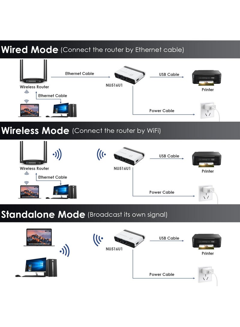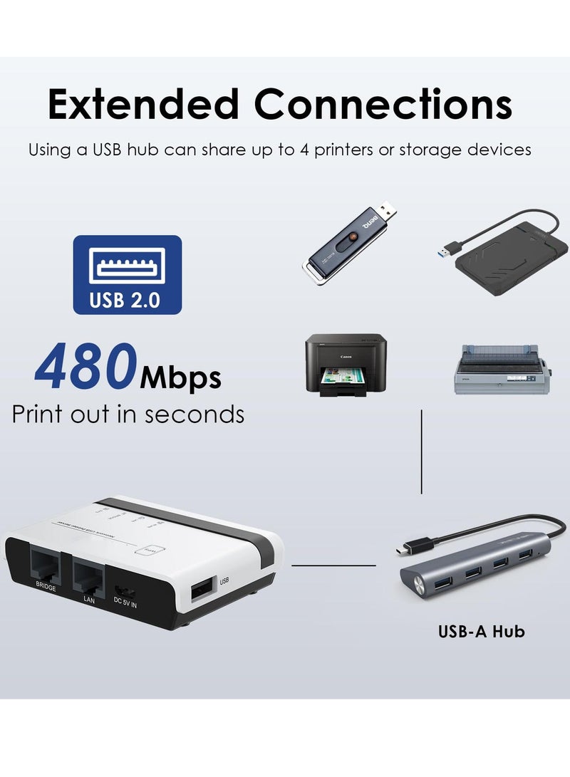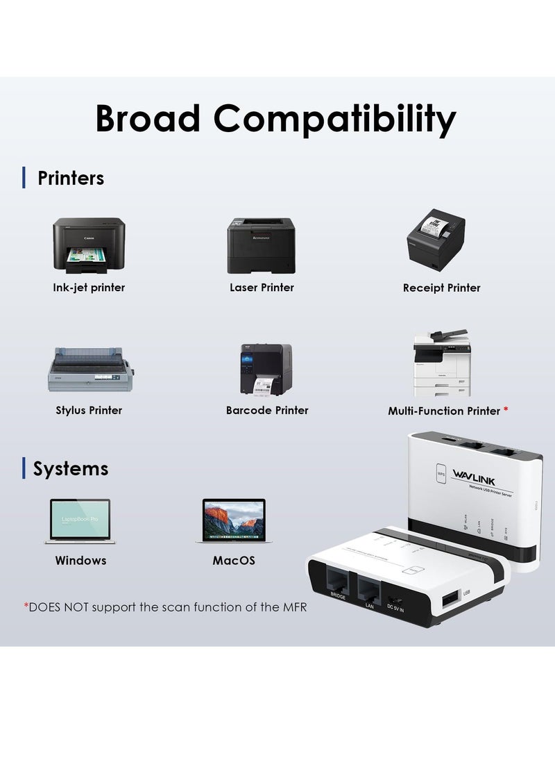 - Supports connecting multi-function printers, but does not support the scanning function of it. This product does not support printing from phones and tablets.