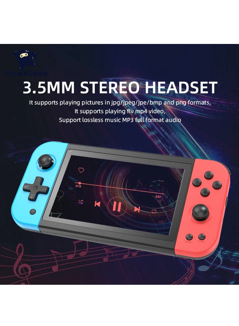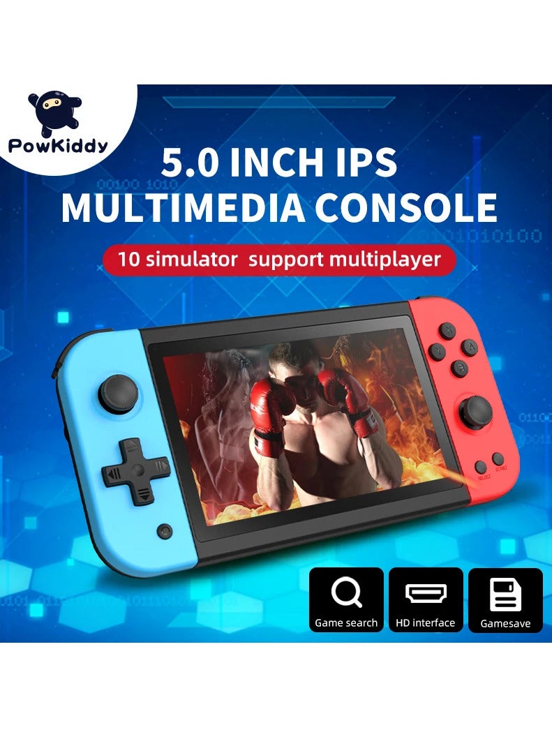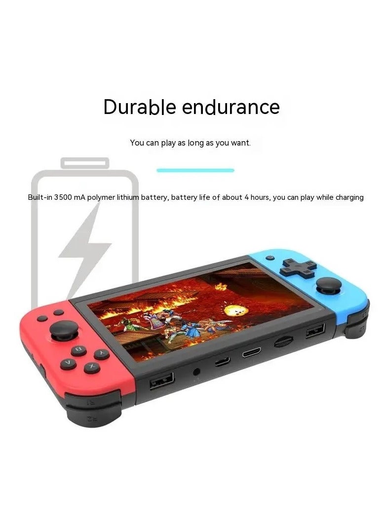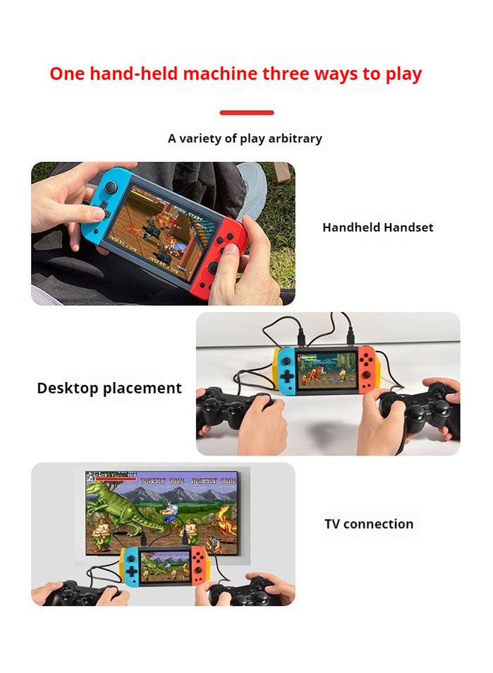 Tech Specsu003cbru003eColor: Black/reddish blue/Yellow/Greenish-blueu003cbru003eDisplay: 5inch HD screen resolution: 800X480u003cbru003eCPU: ATM7051 quad-core arm cortex-A9 with a clock frequency of 900MHzu003cbru003eRAM: LPDDR2 128Mu003cbru003eMemory: 64Gu003cbru003eSystem: Suitable for Android systemsu003cbru003eImage function: support to play jpg, jpeg, bmp, png format picturesu003cbru003eVideo format: Support to play FLV, MP4 format videou003cbru003eMusic function: Support full format audio without dropping music mp3u003cbru003eGames Support: PS/CPS/FBA/GBA/GBC/NEOGEO/SFC/MD Support users to add games in related formatsu003cbru003eLanguages: Chinese, Englishu003cbru003eExternal features: a pair of dual high-quality speakersu003cbru003eBattery: Polymer lithium-ion battery 2500mAhu003cbru003eTF card: Support TF card expansion, up to 64GBu003cbru003eHandle: Supports two wired handle connectionsu003cbru003eu003cbru003eOther features:u003cbru003eSupport 3.5mm stereo headphonesu003cbru003eDisplay and free setting of various functional attributes such as energy-saving settings, display brightness, interface background, etcu003cbru003eSupports dual handlesu003cbru003eProduct weight: about 350gu003cbru003eu003cbru003eIn the Boxu003cbru003eGame console*1, Charging cable*1, Packaging box*1, Instructions*1, User Guide*1