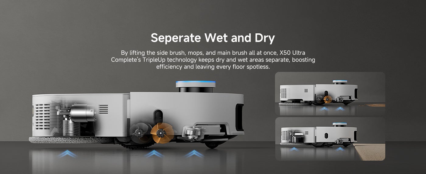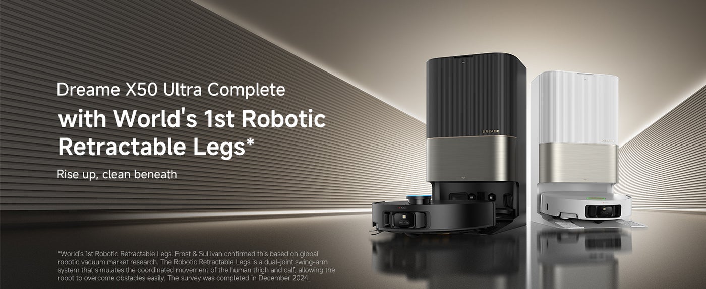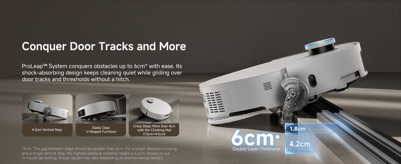 【Cross Thresholds and Barriers】With its Robotic Retractable Legs, X50 Ultra Complete conquers door tracks, thresholds, and obstacles up to 6cm. It uses shock absorbers, silicone pads, and an OmniDirtional wheel to minimize impact and noise, ensuring a smoother, quieter cleaning experience.