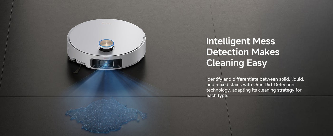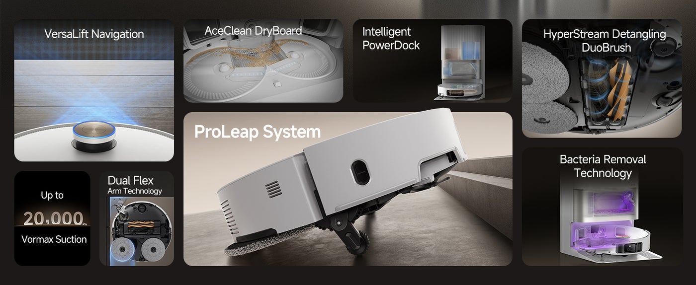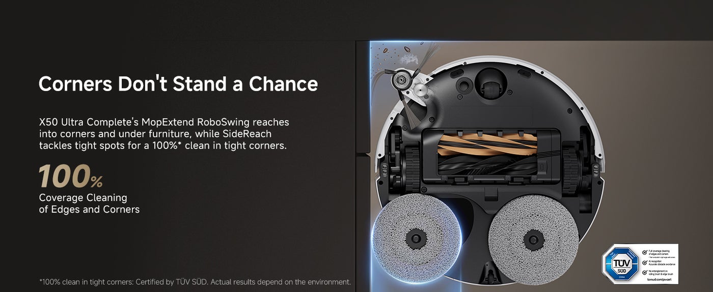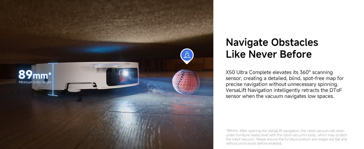 【Easily Clean Under Sofas and More】VersaLift Navigation lowers X50 Ultra Complete's height to 89mm, allowing it to navigate under furniture easily. The AI camera with LED guidance in tight spots ensures precise navigation and obstacle avoidance.