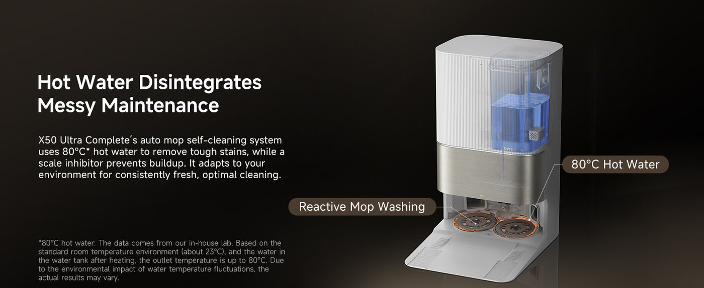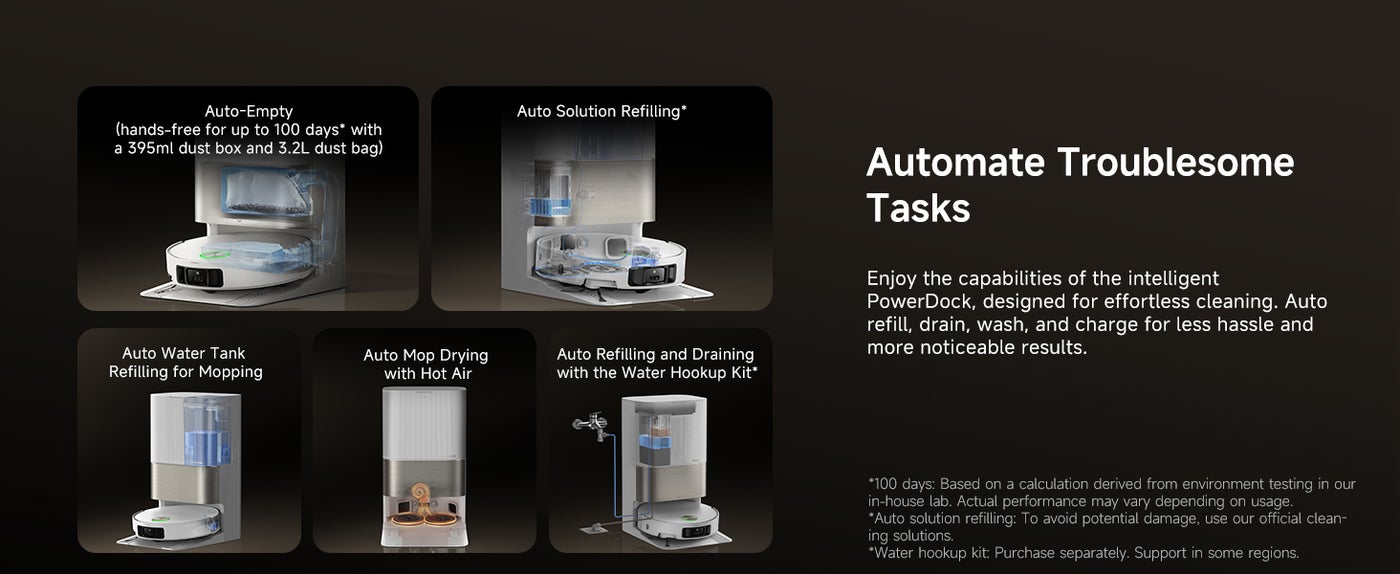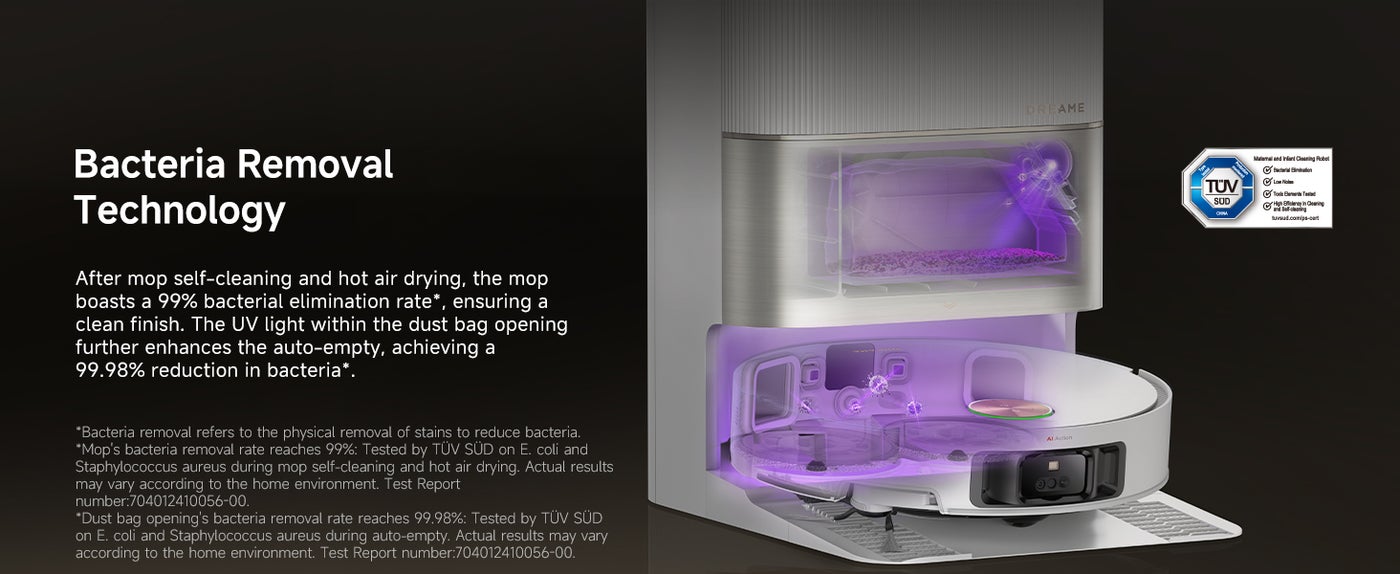 【All-in-1 with UV Lighting for a Hygenic Home】The all-in-1 PowerDock with Bacteria Removal Technology streamlines cleaning and promotes a healthier home. Enjoy hands-free use with automatic emptying, refilling, draining, and drying. The 80°C hot water mop cleaning and UV light eliminate bacteria, ideal for families.