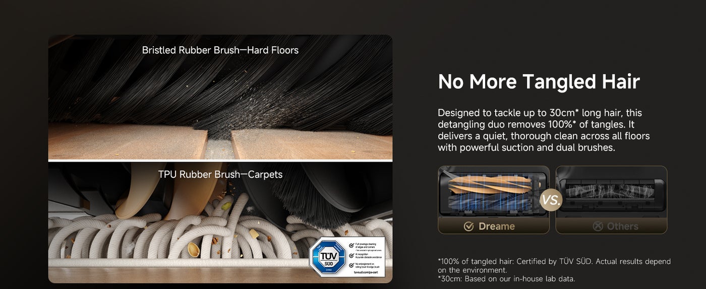 【Restore Your Home without Tangles】Eliminate hair tangles with the HyperStream Detangling DuoBrush, managing up to 30cm long strands. Its air duct design flings and powerfully sucks up hair, while the bristled rubber brush and TPU rubber brush, featuring soft nylon bristles and TPU rubber, provide quiet, deep cleaning on all floors.