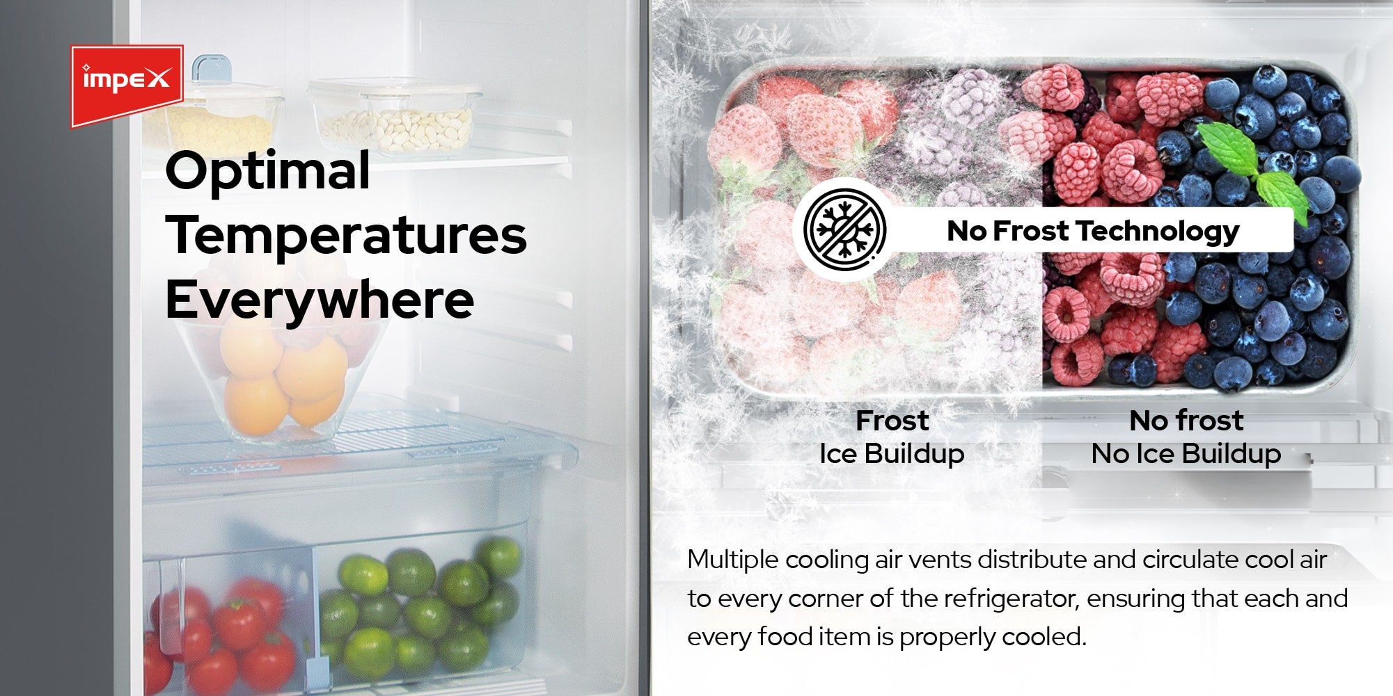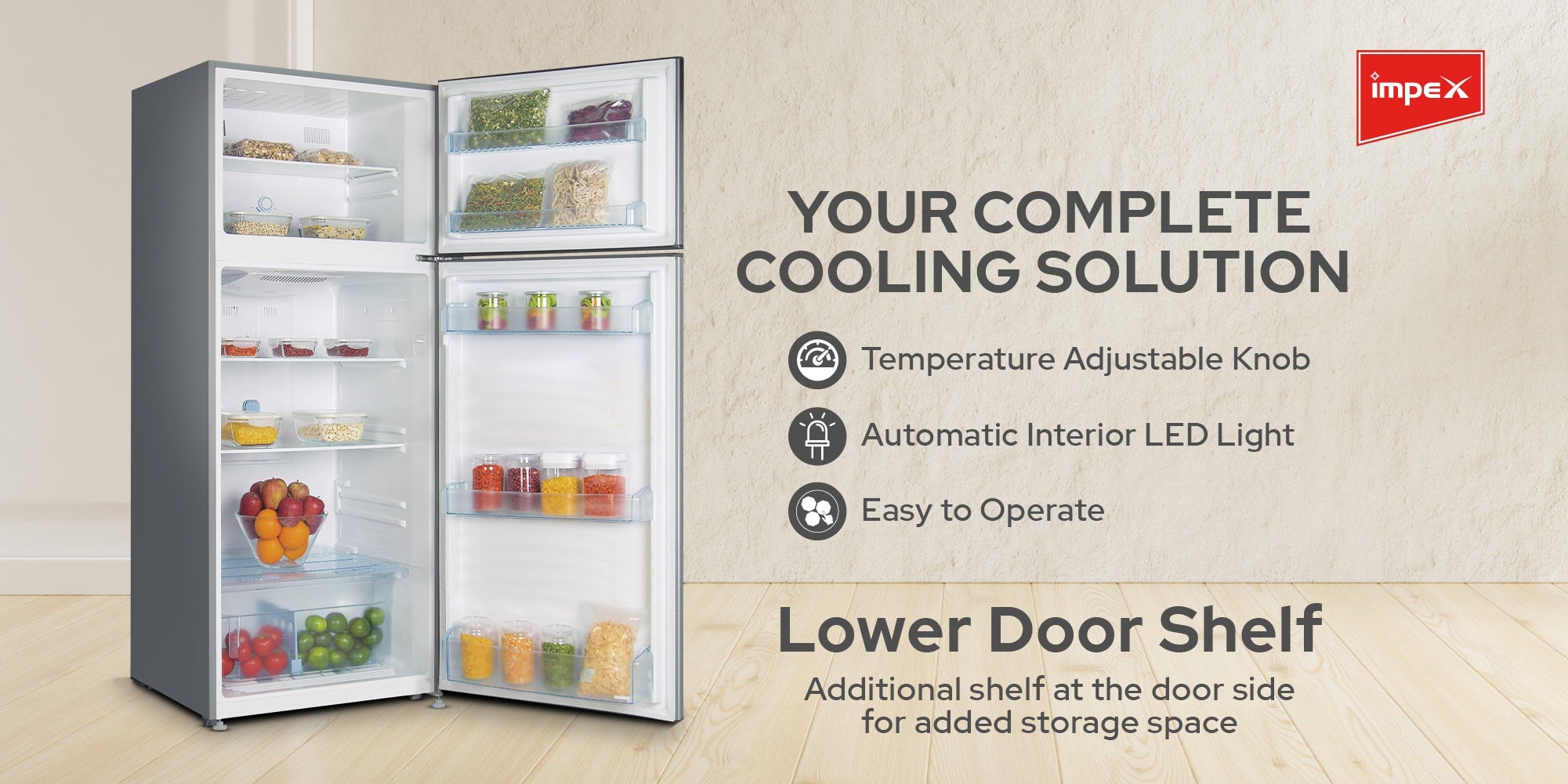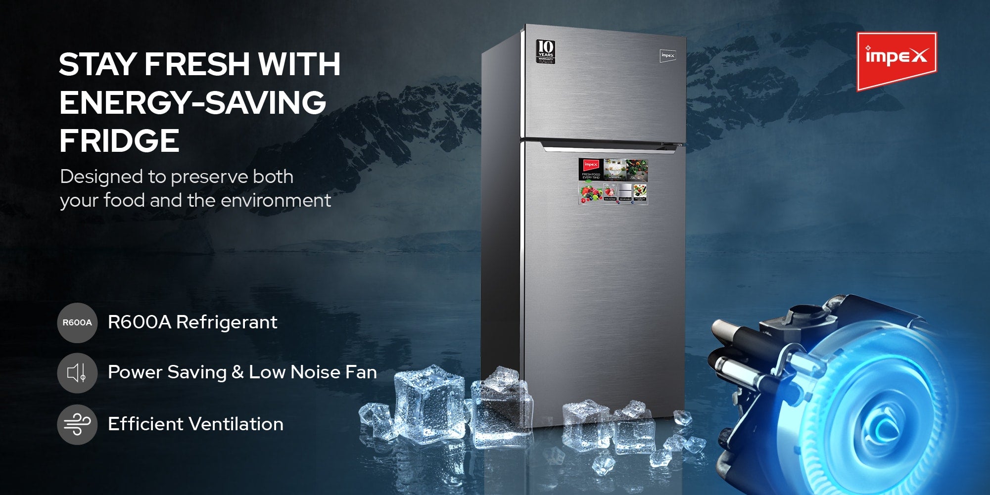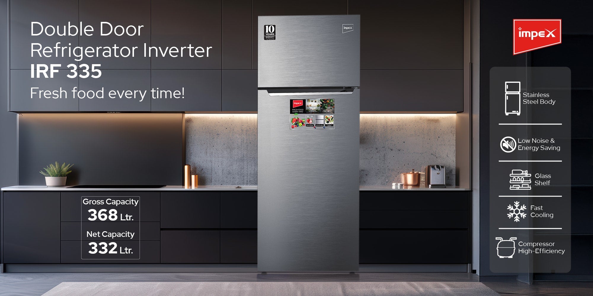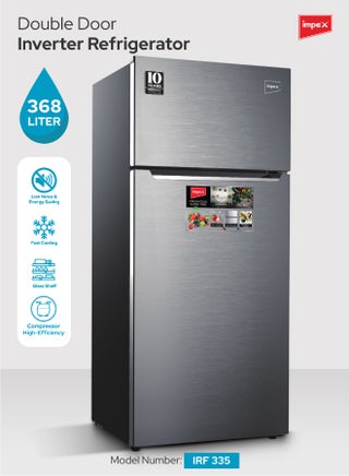 Impex 368 liter No-Frost Inverter Refrigerator (IRF 335), is a perfect blend of style, efficiency, and innovation for your kitchen. With a gross capacity of 368 litres, including a 93-litre freezer and a 275-litre refrigerator, this fridge offers ample space for all your storage needs. The inside condenser ensures consistent cooling, while the high-efficiency compressor reduces energy consumption, making it both powerful and eco-friendly. The adjustable legs make installation a breeze, allowing you to easily level the refrigerator in any kitchen space. The convenient egg tray and interior lamp help you organize and access your essentials with ease. Operating quietly, this refrigerator ensures a peaceful environment in your home, and its energy-saving features contribute to lower electricity bills. The no-frost freezer prevents ice buildup, eliminating the need for manual defrosting and ensuring hassle-free maintenance. With rapid cooling technology, your food and beverages are quickly chilled for immediate use. The sleek one-line handle and elegant dark silver finish add a touch of sophistication to any kitchen decor. Designed for modern living, the Impex 368 Liter No-Frost Inverter Refrigerator combines functionality with style, offering a net capacity of 332 litres and efficient power consumption of 150W. Upgrade your kitchen with this reliable and stylish refrigerator that meets all your cooling needs.