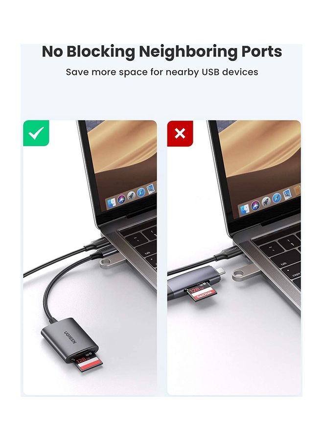 【Dual Slot Card Reader】: The 2-in-1 USB C to SD card adapter gives you the flexibility and convenience of accessing multiple types of memory cards. With support for reading and writing 2 cards simultaneously