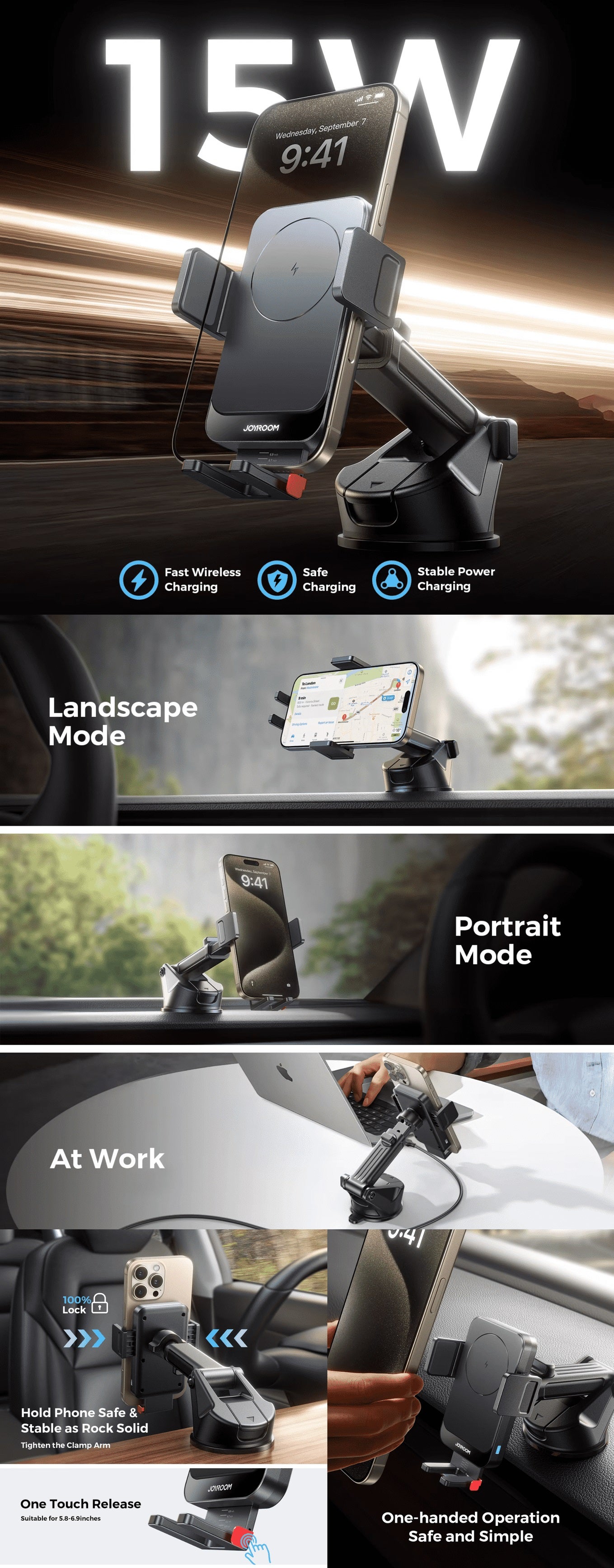 قم بترقية تجربة قيادتك مع حامل شاحن السيارة اللاسلكي JOYROOM، المصمم للأداء والسلامة والراحة. مصمم لأسلوب الحياة السريع اليوم، هذا الشاحن اللاسلكي 15 واط هو أكثر من مجرد حامل هاتف - إنه مساعدك المثالي بدون استخدام اليدين على الطريق.
