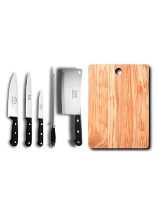 | الطقم يتضمن | 1x chef knife wide, 1xchef knife narrow, 1xbutcher knife, 1xutility knife,1xknife sharperner, 1 bamboo cutting board |