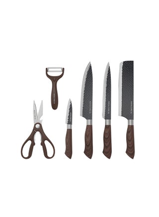 | محتويات العلبة | 3.5" Paring Knife, 8" Cleaver Knife, 8" Carving Knife, 8" Chef Knife, Ceramic Peeler, Kitchen Scissors |