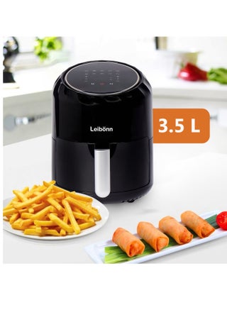 The perfect crisp, at the touch of a button. With the Leibonn digital air fryer, you can prepare healthy and delicious food without using any oil. This air fryer is made of premium-quality materials and is designed and manufactured to make everyday cooking easier. The 3.5-liter digital air fryer ranks high in both looks and efficiency and is ideal for cooking perfectly cooked, healthy, low-fat food without oil for the entire family. The air fryer uses VORTX air frying technology that cooks 30% faster with 99% less oil and ensures that the food is not greasy. It helps you prepare delicious foods that are crispy on the outside and tender on the inside with little to no added oil. The fryer has a touchscreen LED display with ten preset cooking programs that let you set the timer from 1 to 60 minutes and the temperature range of 50 to 200 degrees Celsius, and it also shows the progress of the food being fried. Preset programs include grilling, air frying, baking, roasting, and much more. You can cook various food items in it, including fries, chicken, sausages, cake, bread, cake, and more. The air fryer is highly durable and corrosion-resistant and can serve you well for many years. The basket is made entirely from the finest quality material, is gentle on food, does not flake off, and is hygienic and safe to use. It does not get greasy, so you can get your fried food out with ease. The strong and sturdy construction provides you with an effortless cooking experience. The air fryer is also easy to clean and maintain. The simple design, black color, and utility features make it an ideal option for your kitchen, and it is also an excellent choice for gifting. The product measures 32x32x34 cm in size and weighs 4 kg. The Leibonn digital air fryer comes with a 2-year warranty.