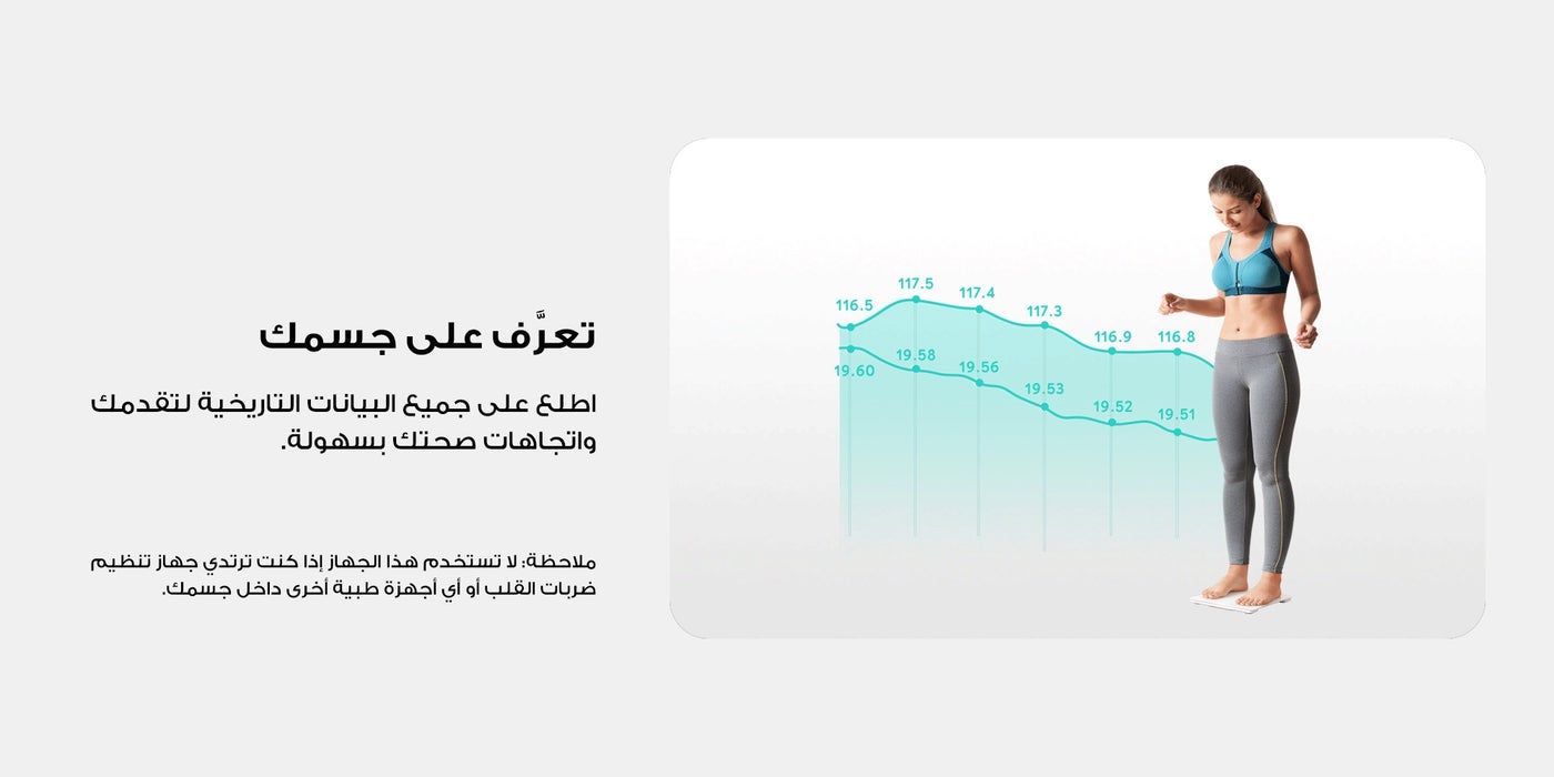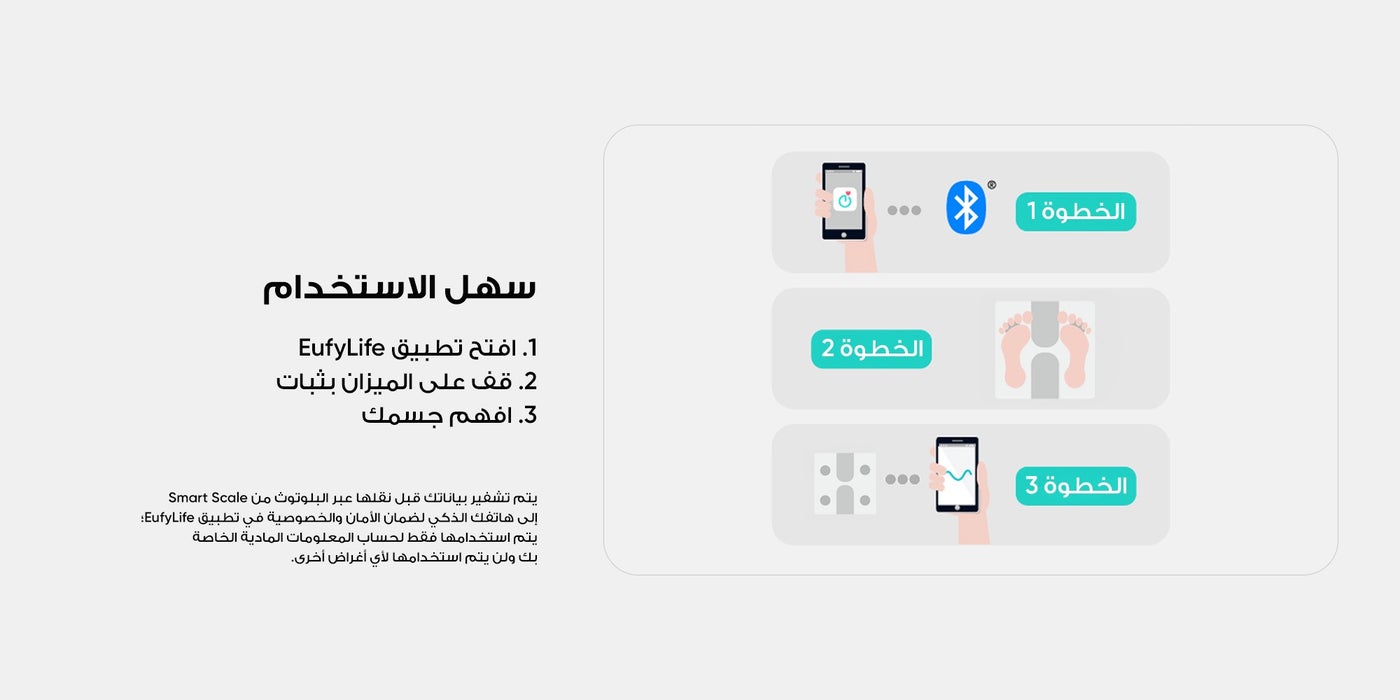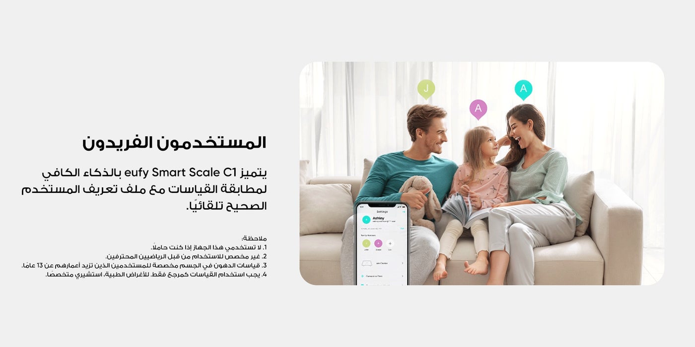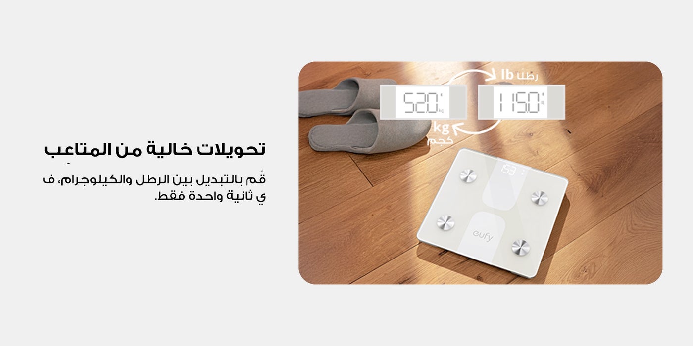 عن المنتج: ميزان C1 الذكي موديل T9146. يعمل الميزان الذكي لكامل الجسم من يوفي، العلامة التجارية التي تضيء حياتك، حلول مبهجة تجعل منزلك تقنية ذكية منزلية وتصميم مبتكر يجعل حياتك أسهل من قبل نفس الفريق الذي يمتلكه أنكررين للحصول على جودة استثنائية ، هيلث اون ديماند ابتكار يعمل مع تطبيق EufyLife مع سمارت سكال C1 لتسجيل البيانات الصحية وتنظيمها بذكاء.. يمكن الوصول إلى سجلاتك دائما على أجهزتك المتوافقة مع نظام أندرويد 6+. عن العلامة التجارية: تعمل يوفي على تطوير جيل جديد من الأدوات والأجهزة المتصلة التي تعمل معا بسلاسة لتبسيط تجربة المنزل الذكي الكاملة. يوفي هي جزء من شركة أنكر إنوفيشنز، وهي واحدة من العلامات التجارية الرائدة والأكثر موثوقية في مجال الإلكترونيات الاستهلاكية في أمريكا. سهل التركيب ما عليك سوى توصيل الميزان الذكي مع تطبيق يوفي هوم على هاتفك الذكي، قم بالدوس عليه بقدمك وشاهد نتائجك. يتم تشفير بياناتك قبل نقلها عبر البلوتوث من الميزان الذكي إلى هاتفك الذكي لضمان الأمان والخصوصية في تطبيق eufylife؛ فهو يستخدم فقط لحساب معاييرك المادية ولن يتم استخدامه أبدا لأغراض أخرى. يتميز ميزان يوفي الذكي C1 الفريد من نوعه بأنه ذكي بما يكفي لمطابقة القياسات مع ملف المستخدم الصحيح تلقائيا. ملاحظة: 1. لا تستخدمي هذا الجهاز إذا كنت حاملا. 2. غير مخصص للاستخدام من قبل الرياضيين المحترفين. 3. قياسات دهون الجسم مخصصة للمستخدمين الذين تزيد أعمارهم عن 13 عاما. 4. يجب استخدام القياسات كمرجع فقط. 5. لأغراض طبية، استشيري اختصاصي. 6. يقيس الوزن بدقة من: 11 رطلا - 397 رطلا | 5 كجم - 180 كجم.