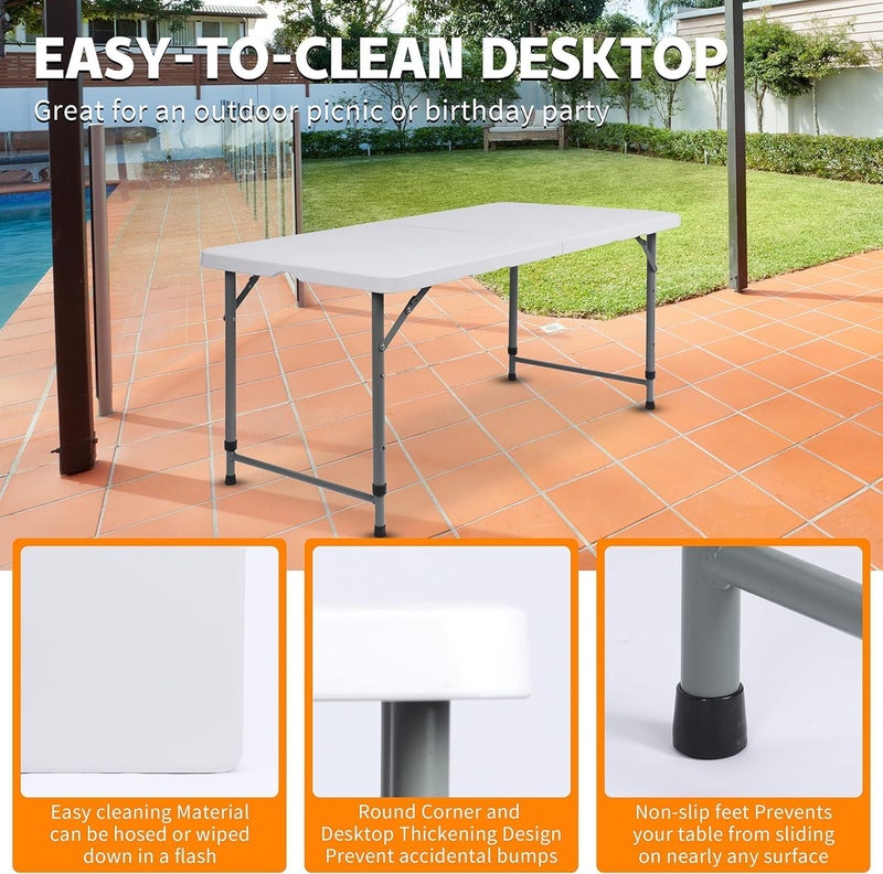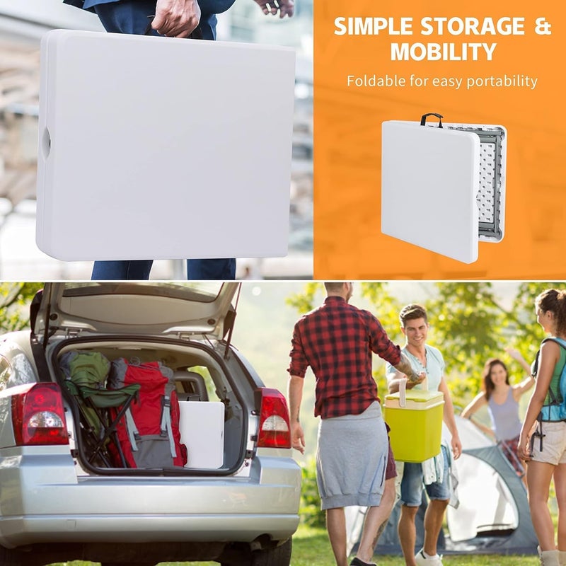 طاولة تخييم خارجية قابلة للطي وخفيفة الوزن، طاولة نزهة بلاستيكية ثقيلة، تطوى إلى نصفين مع مقبض حمل، بيضاء