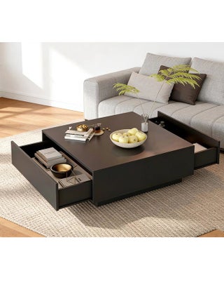 طاولة قهوة مربعة كبيرة للتخزين مع درجين للإغلاق الناعم وقاعدة متينة، طاولة أريكة حديثة بسيطة، طاولة وسطية خشبية 90×90×35 سم، طاولة شاي لغرفة المعيشة وغرفة الاستقبال، سهلة التجميع، لون أسود