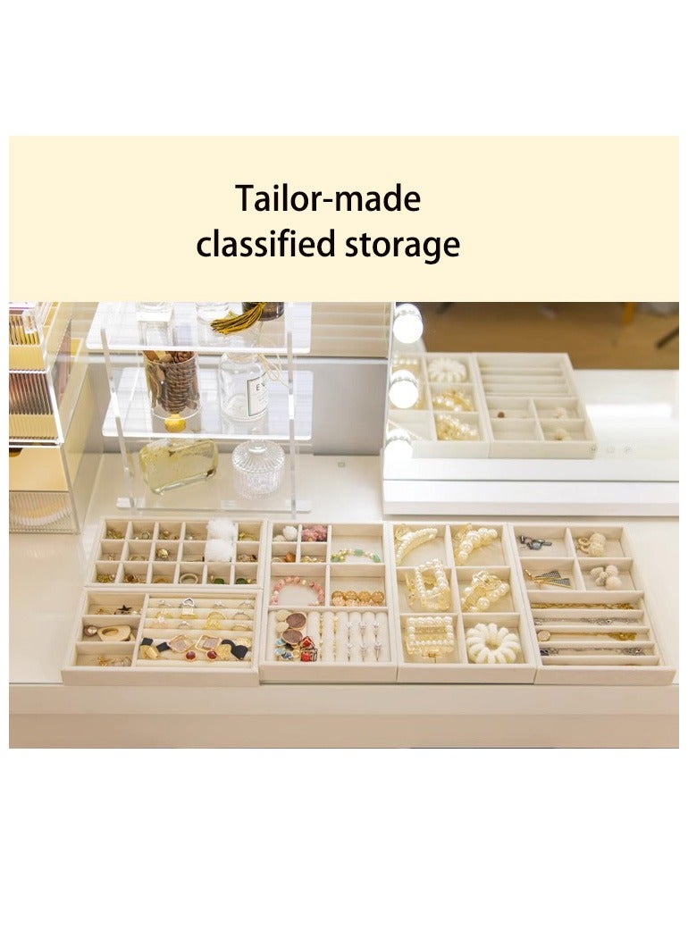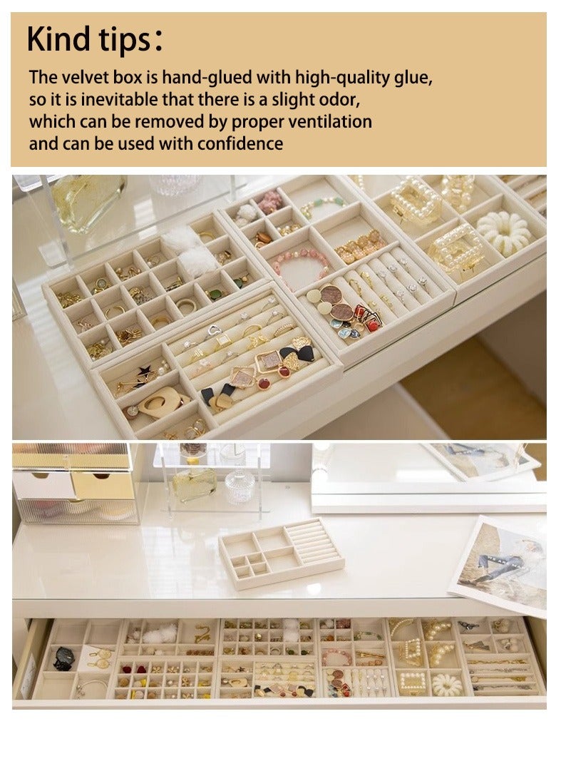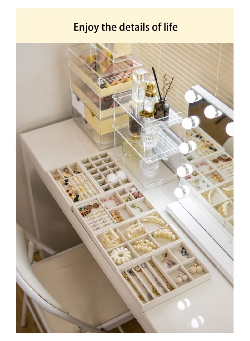 نقدم لك مجموعة منظم المجوهرات المخملية الرائعة المكونة من 4 قطع، وهي ضرورية لأي شخص يتطلع إلى الحفاظ على مجموعة المجوهرات الخاصة به في حالة جيدة مع إضافة لمسة من الأناقة إلى منزله. تتميز هذه المجموعة متعددة الاستخدامات بأربعة صواني مميزة، كل منها مصمم بعناية لتناسب أنواع مختلفة من المجوهرات. سواء كانت خواتم أو أقراط أو قلادات أو أساور، سيكون لكل قطعة مكانها المخصص، مما يجعل العثور على كنوزك وتنظيمها أسهل من أي وقت مضى. صُنعت هذه المنظمات من مادة مخملية عالية الجودة، وهي متينة وجميلة. لا تضيف البطانة المخملية الناعمة شعورًا فاخرًا فحسب، بل توفر أيضًا الحماية اللازمة للحفاظ على مجوهراتك خالية من الخدوش والبقع. صُممت الصواني لتناسب تمامًا الأدراج أو على طاولة الزينة الخاصة بك، وتسمح طبيعتها المعيارية بترتيب مرن لتناسب احتياجاتك المحددة. إحدى السمات البارزة لمجموعة المنظم هذه هي قدرتها على تعزيز الجاذبية الجمالية لغرفتك. التصميم الأنيق والحرفية الفائقة تجعلها إضافة أنيقة لأي ديكور. لا تقتصر هذه المجموعة على التنظيم فحسب، بل إنها تضفي شعورًا بالنظام والجمال على مساحتك، وتحول روتينك اليومي إلى تجربة أكثر متعة واحتفالية. إن مجموعة منظم المجوهرات هذه، التي تعيش في الشرق الأوسط، حيث تحظى الأناقة والاهتمام بالتفاصيل بتقدير كبير، تعد إضافة مثالية لمنزلك. فهي لا تساعدك فقط على الحفاظ على أغراضك الثمينة مرتبة بشكل أنيق، بل إنها تتوافق أيضًا مع التقدير الثقافي للإكسسوارات المنزلية المصنوعة بشكل جميل والعملية. من خلال دمج مجموعة المنظم هذه في حياتك اليومية، ستختبر تحسنًا كبيرًا في جودة مساحة معيشتك. إن البيئة المنظمة والخالية من الفوضى التي تخلقها لن تجعل العثور على مجوهراتك واستخدامها أسهل فحسب، بل ستجلب أيضًا شعورًا بالهدوء والرضا، مما يعزز في النهاية سعادتك ورفاهتك بشكل عام.