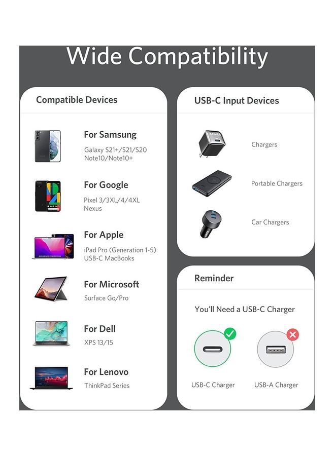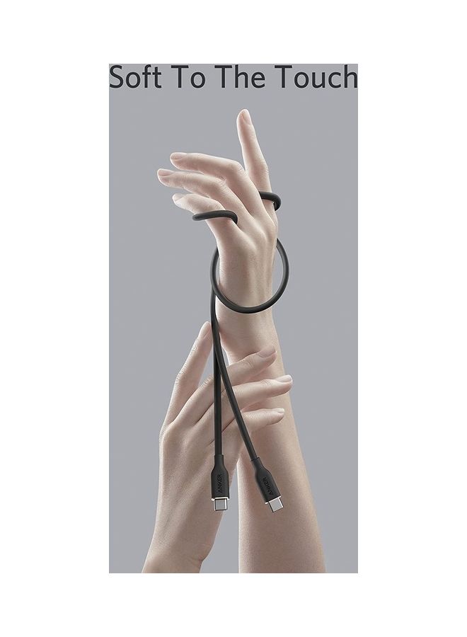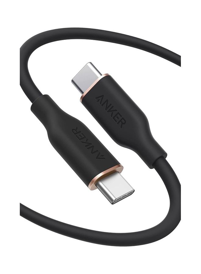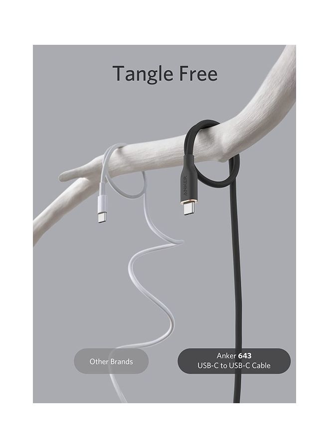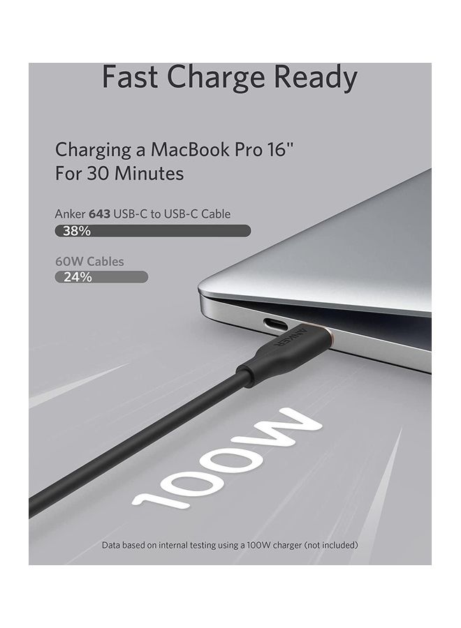 Model Number: A8553 Anker 643 USB-C to USB-C Cable (Flow, 6ft Silicone) Super Strong, Surprisingly Soft Feel the Difference: Once you’ve held this surprisingly soft silicone cable in your hand, you’ll never go back to regular cables. Built to Last: Features a triple-layered system of copper wires, flexible graphene, and silicone for enhanced flexibility without any loss in durability. The result is a cable with a tensile strength of 220 lbs (100 kg) and a 25,000-bend lifespan. More than enough to take the strain of a dangling phone or tablet. Neat and Tidy: Use the included silicone strap to keep the cable neatly coiled when stored away in a drawer, bag, pocket, or anywhere else. Note: Travel pouch not included. Flex Your Style: Find a look to suit you and your phone. Choose from 7 fresh finishes: Misty Blue, Daffodil Yellow, Lilac Purple, Lavender Grey, Mint Green, Cloud White, and Midnight Black. Fast Charging Ready: Compatible with Power Delivery fast charging and supports up to 100W to charge your phone, tablet, laptop, or virtually any other USB-C device at its maximum possible speed. Note: Requires a compatible Power Delivery high-speed charger. Supports File Transfer Move photos, music, and movies between USB-C devices at speeds of up to 480 Mbps. Notes This cable does not support media display. Compatibility: Fully Compatible Device MacBook Pro 14-in. (2021) MacBook Pro (M1,2020) MacBook Pro (2019/2018/2017/2016) 15.4'' MacBook Pro (2020/2019/2018/2017/2016) 13.3'' MacBook Air (2020/2019/2018) iPad Pro 12.9-inch (5th/4th/3rd/2nd/1st generation), iPad Air (4th generation) iPad Mini (6th generation) SamSung Galaxy Note 10+/10/9/8 SamSung Galaxy S21/S21+/S20/S10+/S10e/S10/S9+/S9 Google Pixel 3 Nintendo Switch/ Switch Lite Lenovo Yoga 14s Compatible Devices (limited charging speeds) LG V40/V30+/V20/G7 MacBook Pro 16-in. (2021)