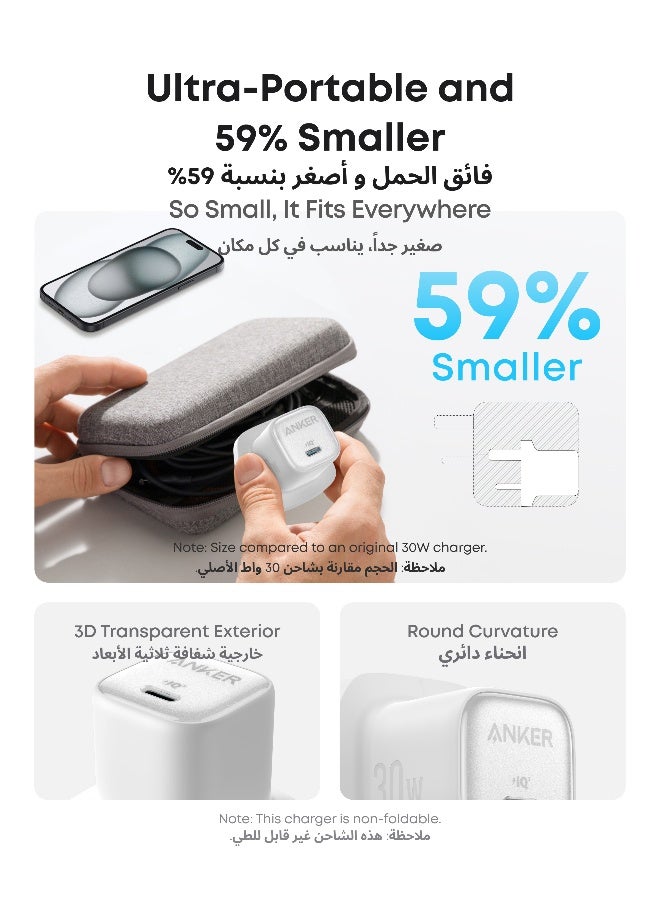 ما ستحصل عليه: شاحن Anker Zolo (30 واط، PD 3.0) مع كابل USB-C بطول 3 أقدام، دليل الترحيب، ضمان خالي من القلق لمدة 24 شهرًا، وخدمة عملاء ودودة.