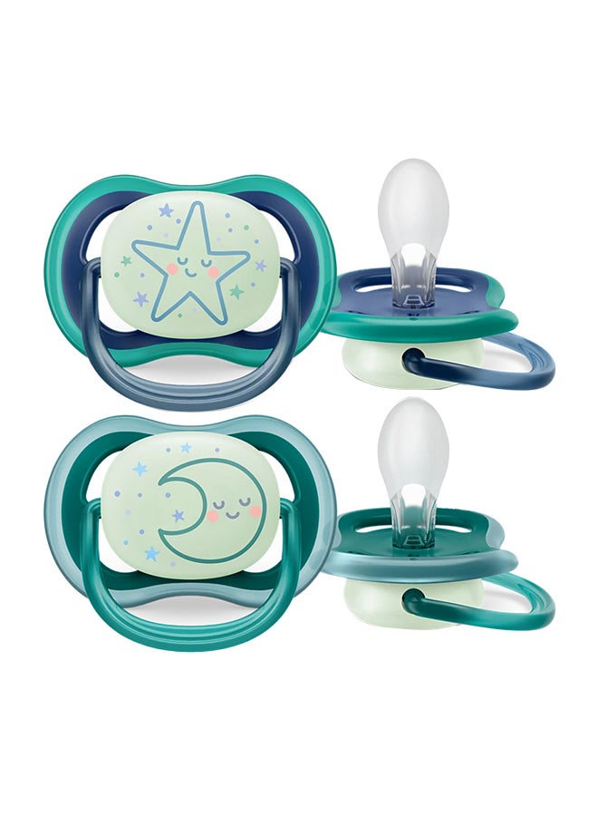 مهدئ ألترا إير ليلي 6-18 شهر للأولاد، 2 قطع | العلامة التجارية رقم 1 الموصى بها من قبل الأمهات في جميع أنحاء العالم | يتوهج في الظلام، خفيف، قابل للتنفس، خالي من BPA، تقويم الأسنان مع علبة تعقيم