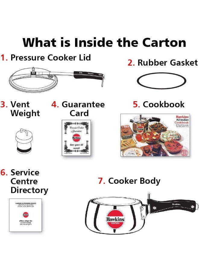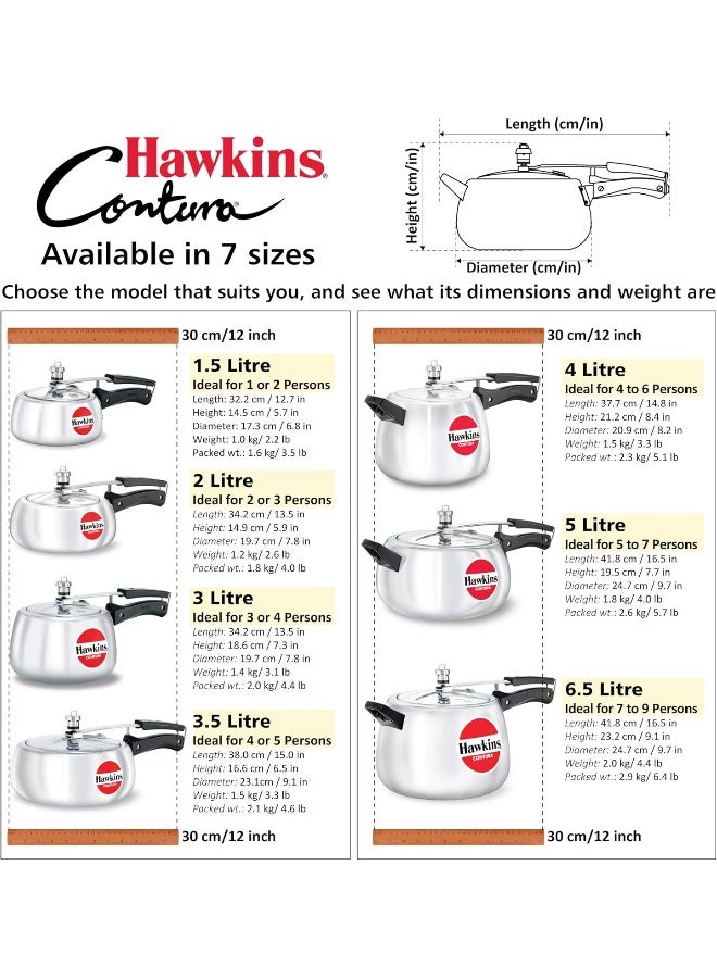 The Hawkins Contura Aluminium Pressure Cooker is designed for hassle-free cooking. It features a unique body with rounded sides for easier stirring, better visibility, and easy removal of food. Made from high-quality aluminium, it has a thick base ensuring extra safety and long life. This pressure cooker is ideal for cooking for 5-7 persons and is compatible with both gas and electric stovetops.
