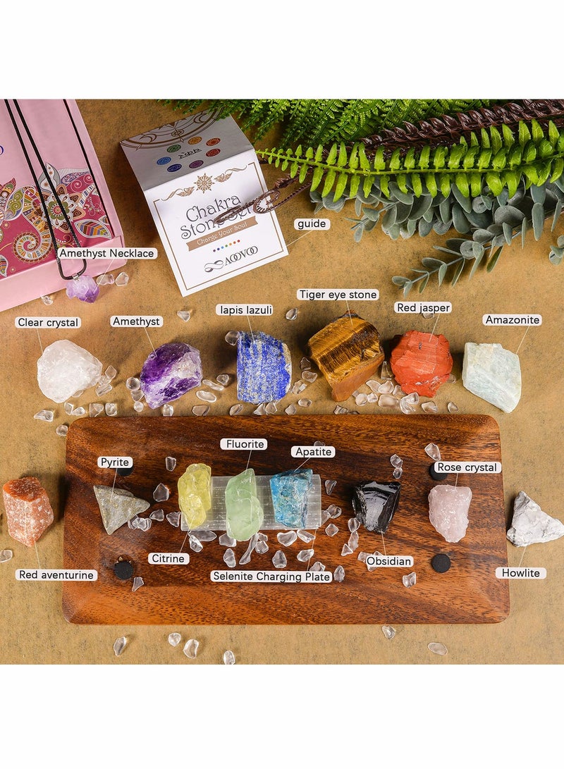 17Pcs Crystals and Healing Stones, 14Pcs Real Raw Chakra Stones Set, Selenite Charging Plate, Amethyst Necklace, Rose Quartz, Gift Box, Guide for Beginners, Collection, Meditation, Yoga, Lady