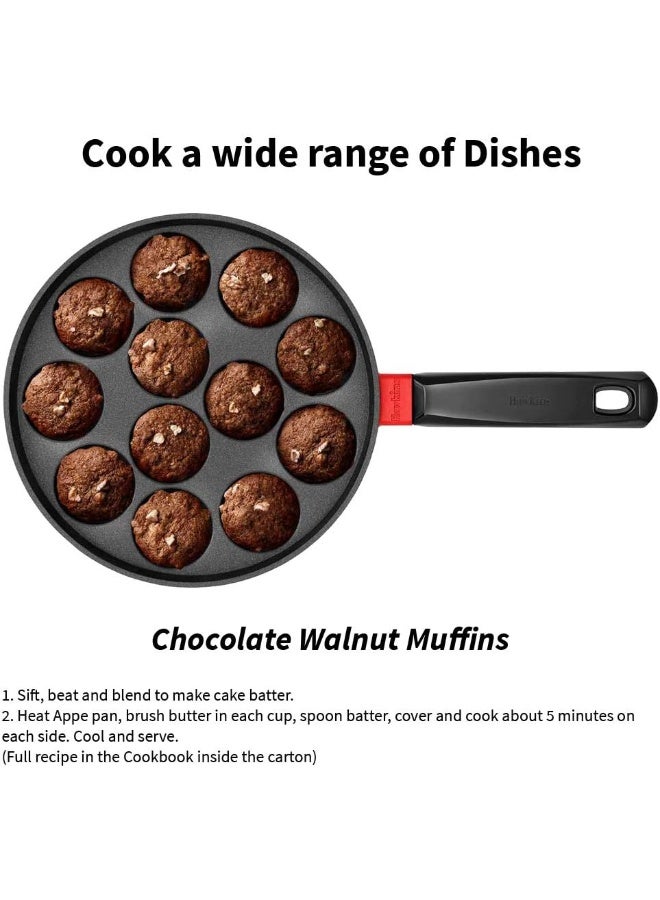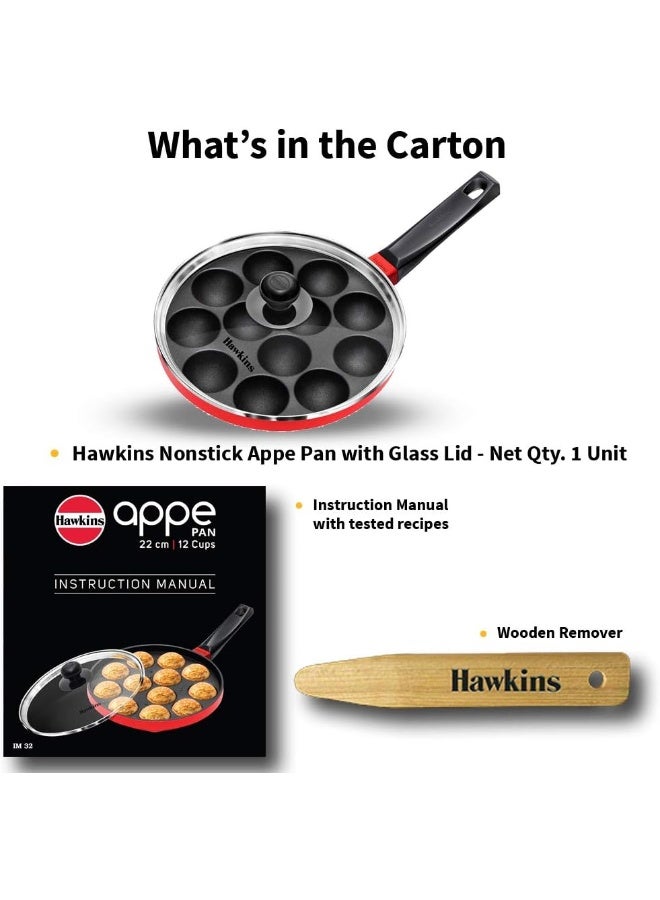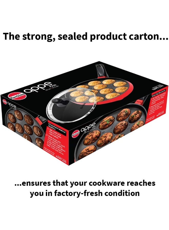 The Hawkins 22 cm Appe Pan is a versatile non-stick pan designed for making various traditional dishes like Paniyaram, Litti, Kuzhi Paniyaram, and Ponganalu. It features 12 cups, each with a volume of 25 ml, and is made from durable cast iron. The pan has a PFOA-free German 3-coat nonstick interior for long-lasting performance and an outer German ceramic coating for great looks and stain resistance. The integrated bracket-cum-flame guard ensures the handle stays cool and secure during cooking. The pan comes with a toughened heat-proof glass lid, allowing you to monitor your food while cooking.