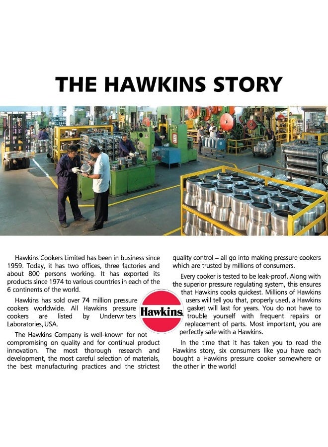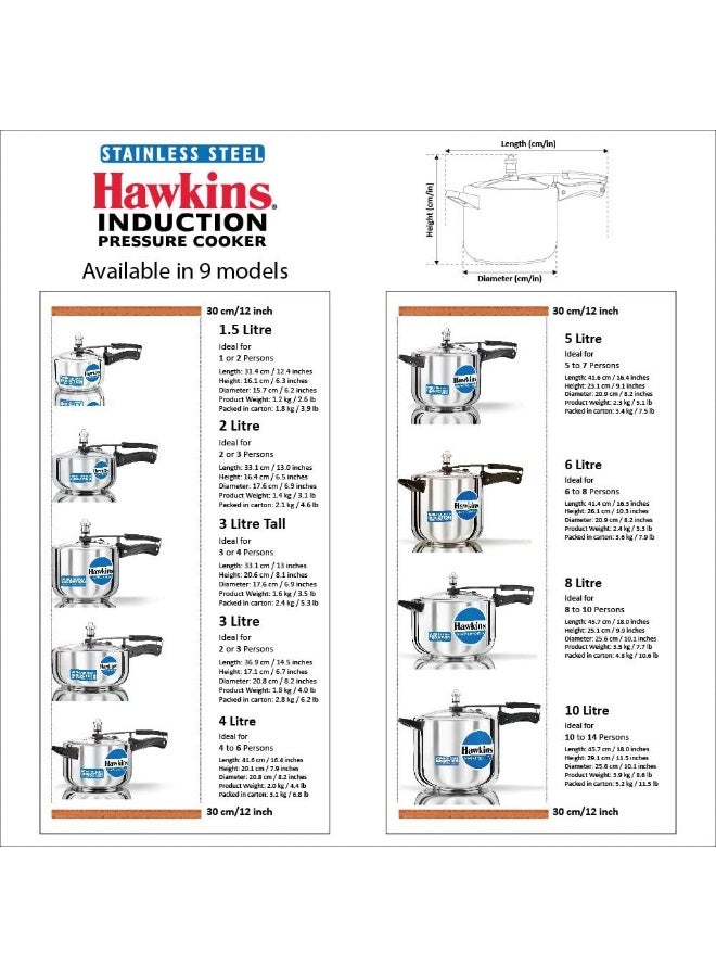 The Hawkins 3 Litre Inner Lid Pressure Cooker is made from food-grade, 18/8, non-magnetic, superior stainless steel (AISI Grade 304). It features an extra-thick sandwich bottom that heats evenly and stays flat always, making it safe for light and deep frying before pressure cooking. The pressure cooker is designed with a unique pressure-locked safety lid that ensures the lid cannot be opened until the pressure has fallen to a safe level. It also includes an improved pressure regulator that saves more fuel and an automatic safety valve positioned to deflect steam and food safely downwards. The gasket lasts longer due to minimal exposure to food acids and the fixed sturdy pivot assists in locking the lid securely.