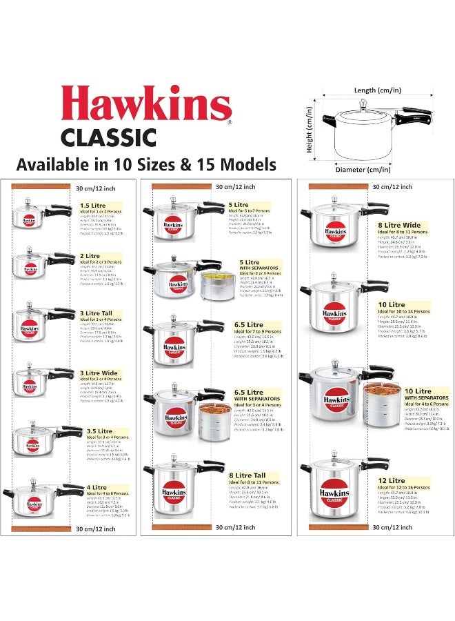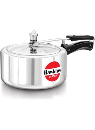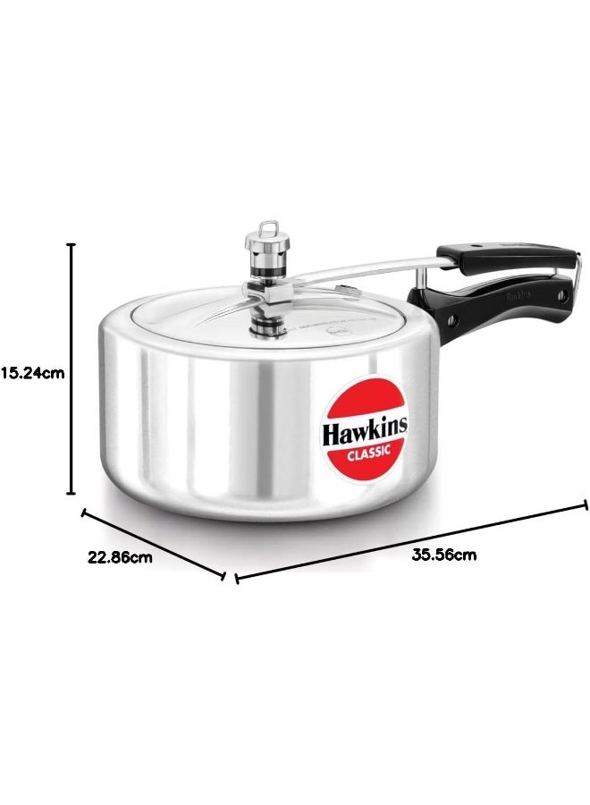 The Hawkins Classic 3.5 Litre Aluminium Inner Lid Pressure Cooker is designed for efficient and fast cooking. Made from pure virgin aluminium, it features an exterior mirror polish and a base thickness ranging from 3.25 to 4.06 mm. This pressure cooker is ideal for 4 to 5 persons and is suitable for gas, electric, ceramic, and halogen cooktops. It includes a superior pressure regulating system that controls pressure to a narrower, more efficient range, reducing sprouting of frothy foods. The safety valve is located under the lid handle bar, ensuring steam is safely deflected downwards. The gasket has minimal exposure to steam, lasting longer. The stay-cool handles and fixed sturdy pivot enhance durability and ease of use.