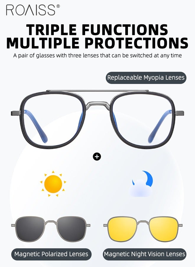 TRIPLE FUNCTION - These glasses are equipped with anti-blue light lenses (replaceable for myopia lenses), magnetic polarized lenses, and magnetic night vision lenses, this versatile eyewear provides comprehensive protection for your eyes.