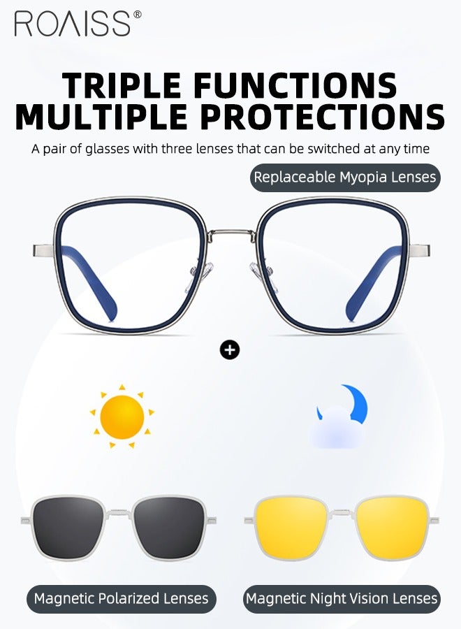 TRIPLE FUNCTION - These glasses are equipped with anti-blue light lenses (replaceable for myopia lenses), magnetic polarized lenses, and magnetic night vision lenses, this versatile eyewear provides comprehensive protection for your eyes.