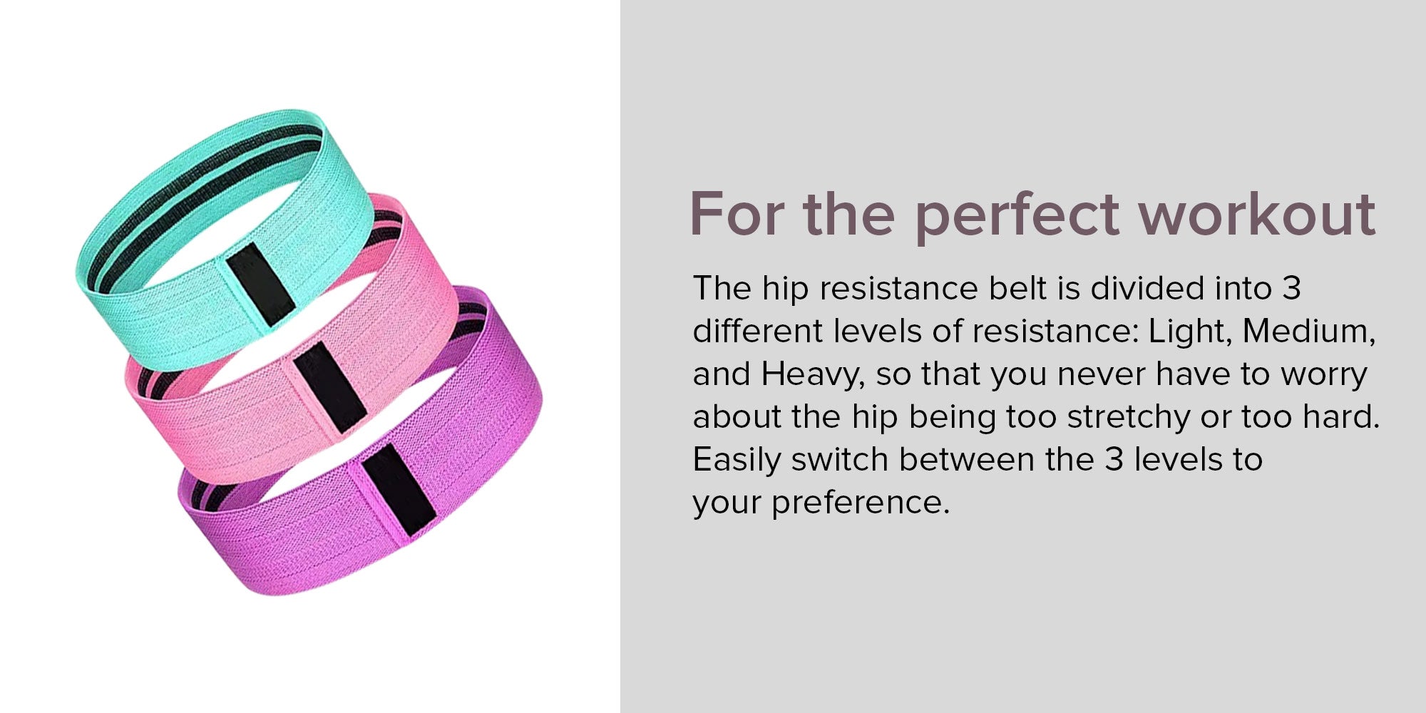 The resistance belt is divided into 3 different levels of resistance:Light, Medium, and Heavy never worry about the hip being too stretchy or too hard, easily switch between the 3 levels to your preference anytime