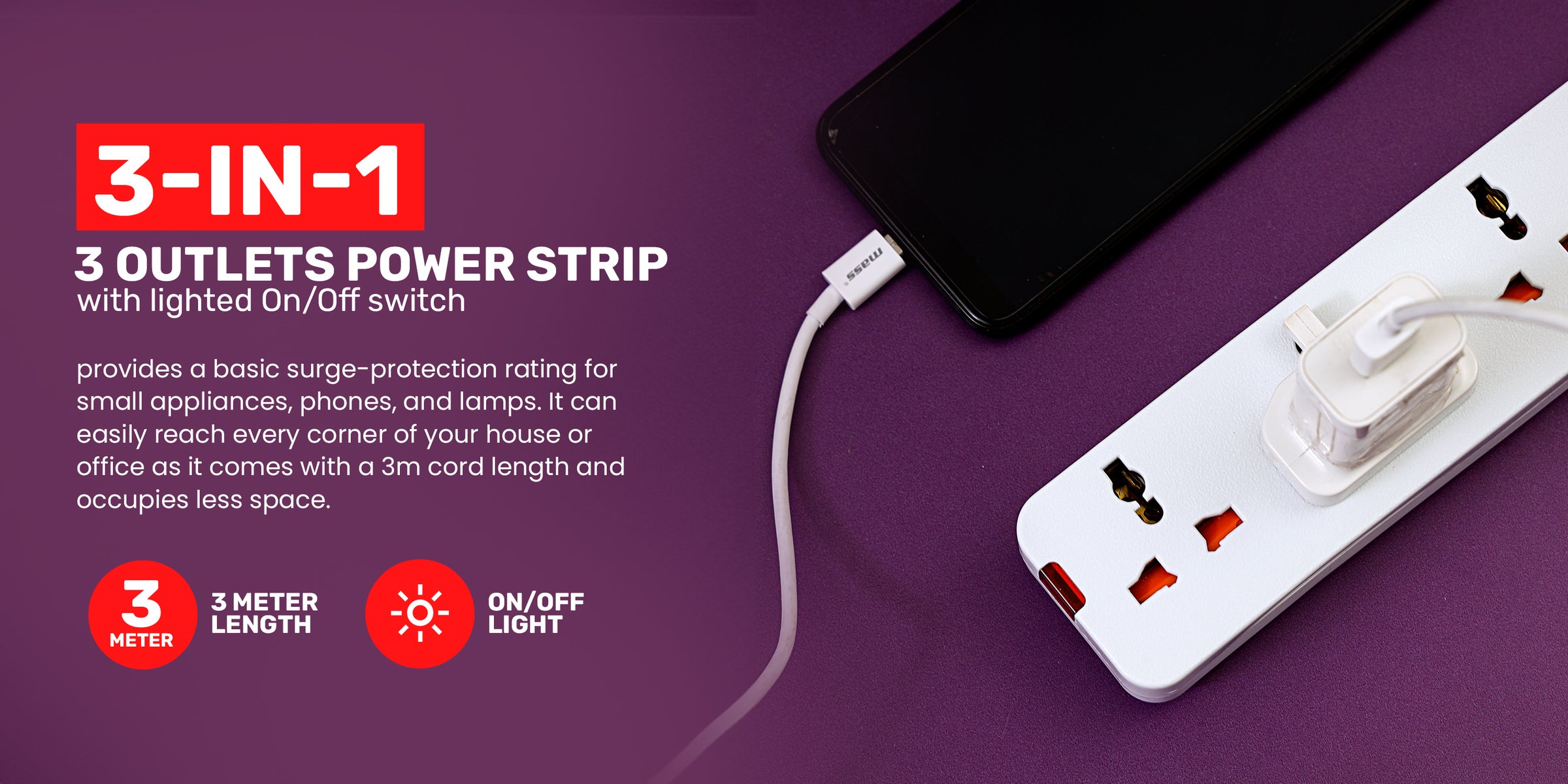 4. 3 METER POWER CORD - Along with its slim, sleek design that effortlessly slides into narrow spaces, the three-outlet, power strip provides a 3-meter extra long power cord to prevent a tripping hazard and to minimize clutter.