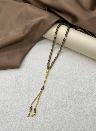 The end of the necklace is decorated with golden tassels and leaf-shaped pendants, adding a sense of magnificence. The design style of these necklaces is elegant and exquisite, suitable for decoration or wearing, presenting a noble and elegant temperament. The overall picture gives people a sense of refinement and elegance, highlighting the beauty and craftsmanship of the necklace.