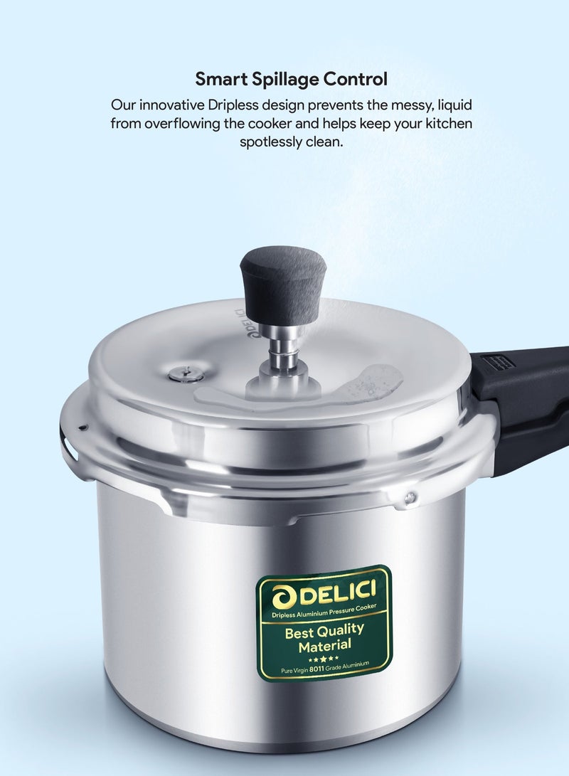 Cook faster and safer with the Delici Dribbles 3-Liter Pressure Cooker (ADPC3E). Made from high-quality virgin aluminum, it heats evenly and is long-lasting. The smart spill control system and leak-proof lid keep your kitchen clean. With its high heat capacity, it reduces cooking time—ideal for busy kitchens. The pressure regulator and gasket release valve ensure safe pressure handling, while the lead-free safety valve adds extra protection. Designed for modern kitchens, it features an induction-powered rapid-heating base and works on gas, induction, and other cooktops. The heat-resistant bakelite handle provides a secure and comfortable grip. Upgrade your kitchen with the Delici Dribbles 3-Liter Pressure Cooker—safe, durable, and easy to use!