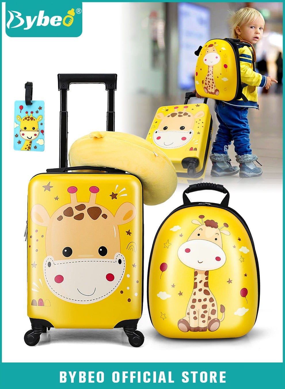 BYBEO brand understands that how to go out with your children conveniently and safely has been a problem for many parents, and that ordinary children's travelling suitcases have too little storage space to fully put down all the items you need. To solve these problems, we have carefully designed this children's travel luggage set to provide you with more storage space and a comfortable travelling experience through the unique combination of luggage, shoulder travel bag and U-shaped pillow.