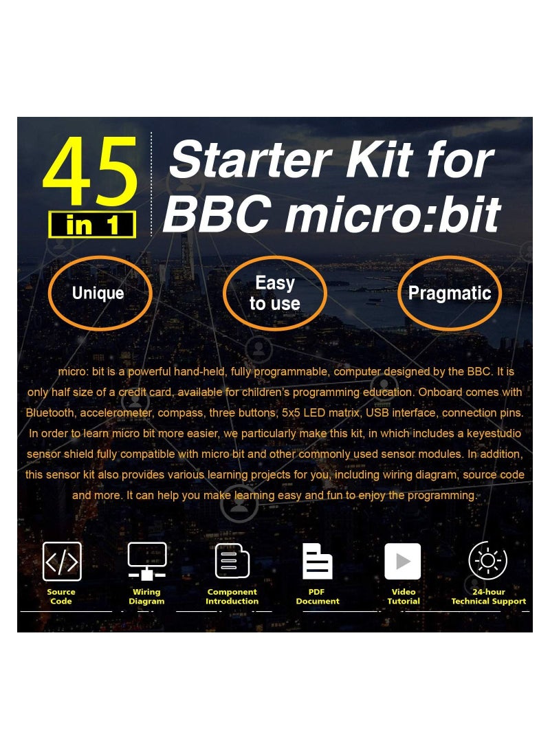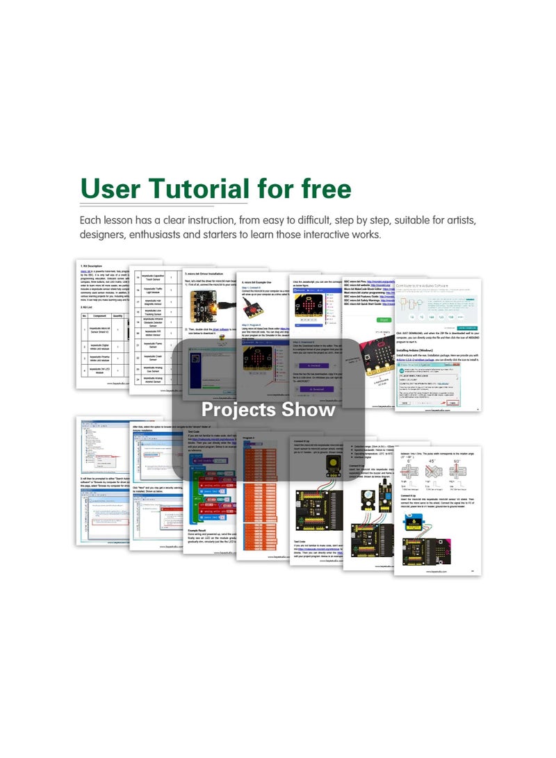 Development Board is Not Included, but this kit is fully compatible with it. It features 45 types of sensors, including LED lights, temperature sensor, I2C LCD, sound sensor, PIR motion sensor, and more. The kit also comes with a USB cable and jumper wires for easy micro connection. This 45-sensor kit has everything you need to start electronics and coding projects, making it perfect for beginners and students aged 10 or older. It includes detailed PDF tutorials with 45 projects that provide step-by-step guidance and work seamlessly with micro software. All the project code is available on the web tutorials for easy access. Each project comes with a circuit diagram and verified code, allowing you to build fun projects like Ultrasonic Ranging, Fire Alarms, Music Players, Pressure Detection, and LCD Displays. With so many parts, there’s almost no limit to what you can create! The kit is easy to use, and technical support is always available to assist.