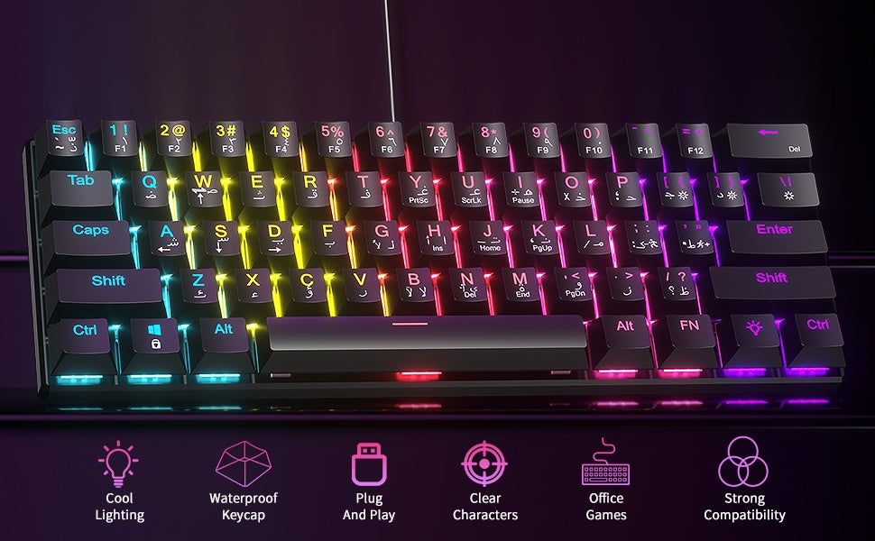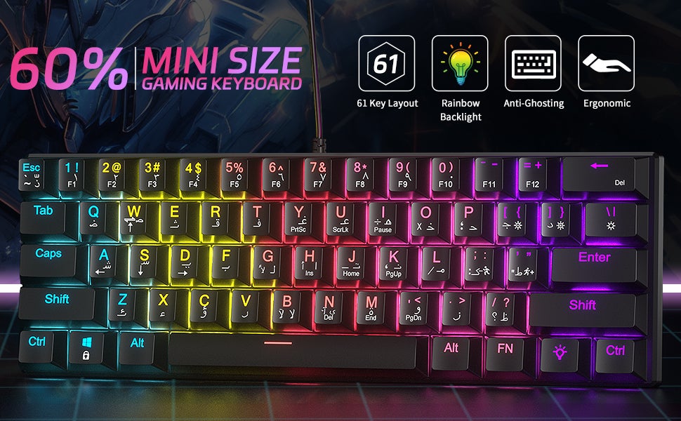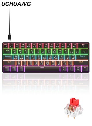 61-Key English Arabic Mechanical Keyboard, Red Switch Hybrid Light Compact Mini Wired Keyboard for PC, Mac E-sports Portable Gaming Keyboard - Black Keyboard