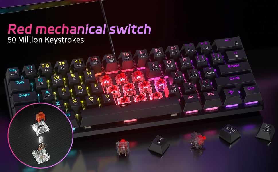 RED SWITCH:Red switches have quiet click sounds, fast action, low resistance, and no tactile collision, making them ideal for work typing and quiet e-sports gaming venues.