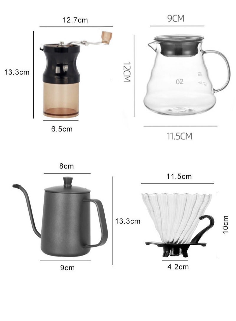 | Set Includes | 1 × Manual Grinder 1 × Glass Dripper 1 × 250ml (8.5) Double Glass Wall Mug 1 × 600ml (20oz) Glass Server 1 × 600ml (20oz) Coffee Kettle 1 × Digital Scale 1 × 40 pcs Paper Filter 1 × Coffee Spoon |