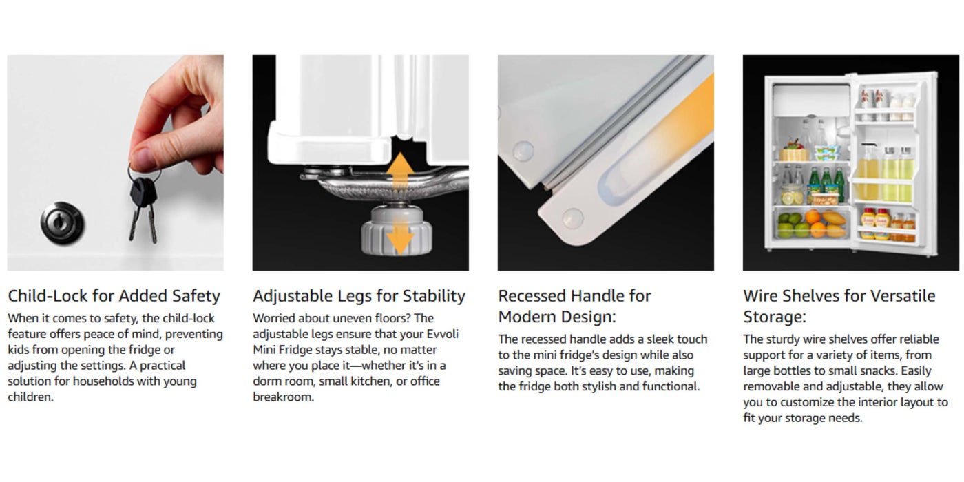 Child-Lock Protection: For added safety and peace of mind, the Evvoli 90L is equipped with a child lock feature, ensuring that your refrigerator is not only a kitchen appliance but also a safeguard for your family.