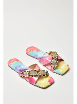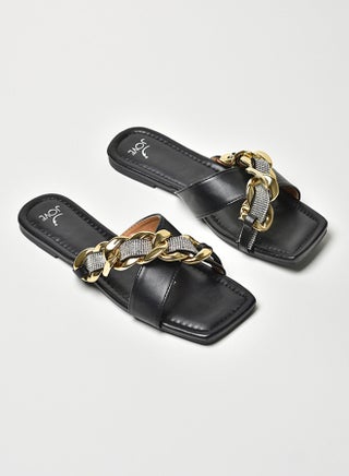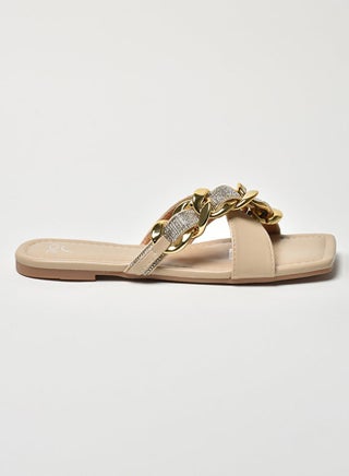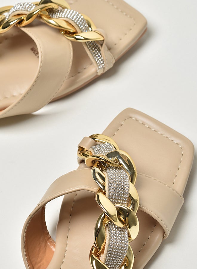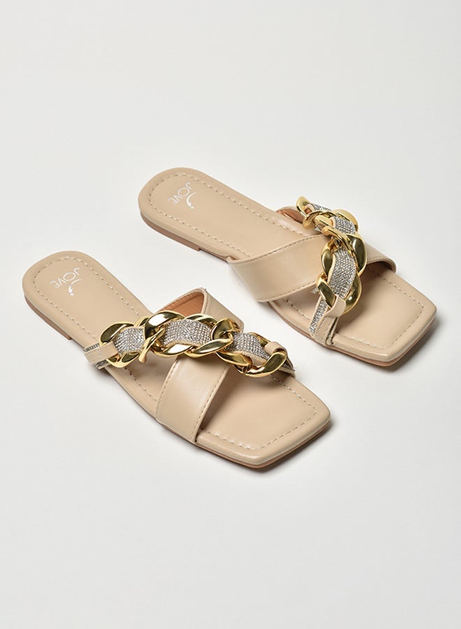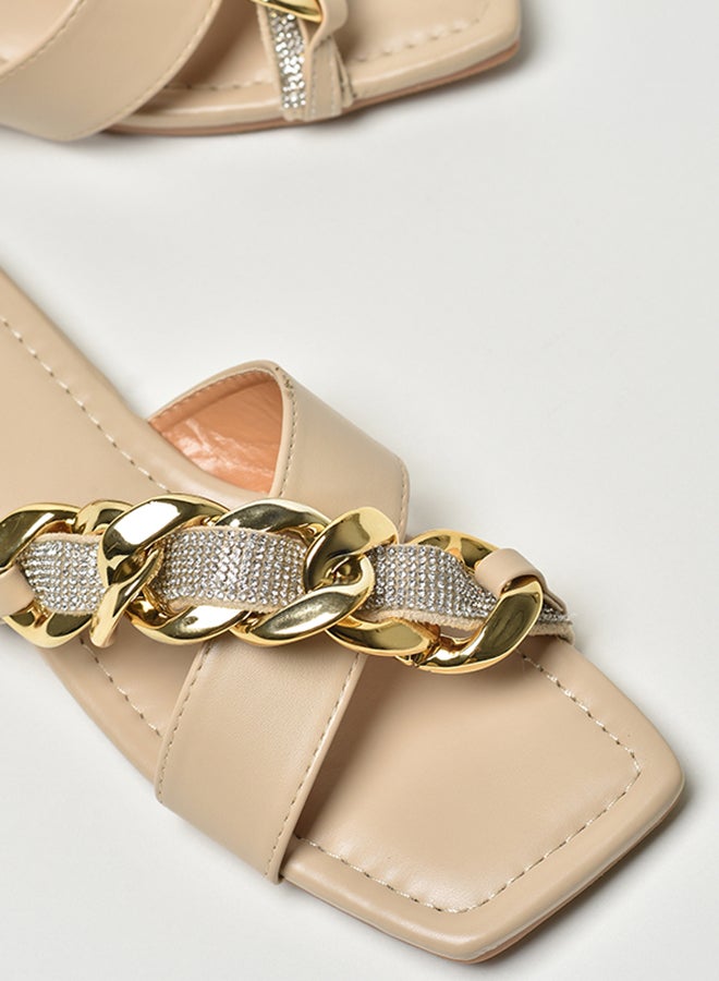 Stone Chain Embellished Strap Slip-On Flat Sandals Beige/Gold/Silver