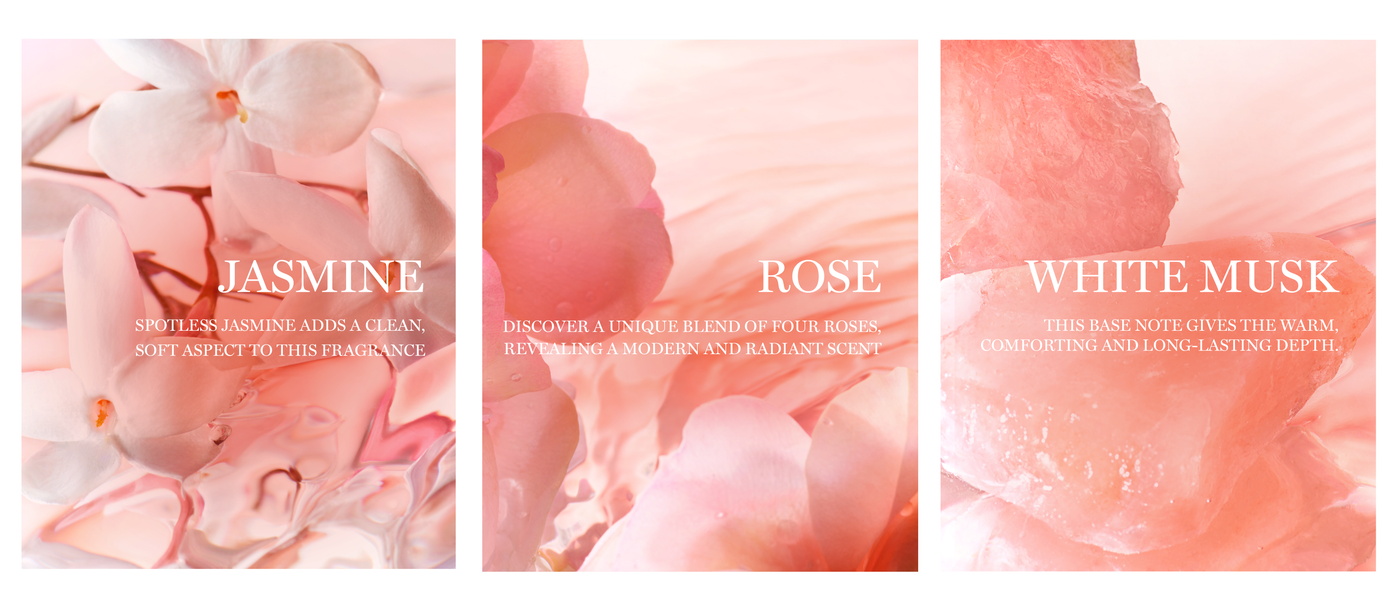 A unique fragrance powered by a trio of outstanding ingredients. A perfume bottle with a dynamic silhouette sharp as will, maintained by a golden chain, symbol of women's will and determination. The bottle through its edges illuminates us and reflects the best in us. A chance to begin a new ride together.