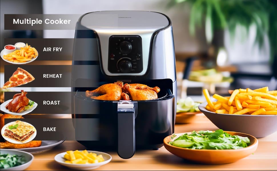Sleek and Stylish Design: The Air Fryer features a modern black color with stainless steel accents, seamlessly fitting into any kitchen.