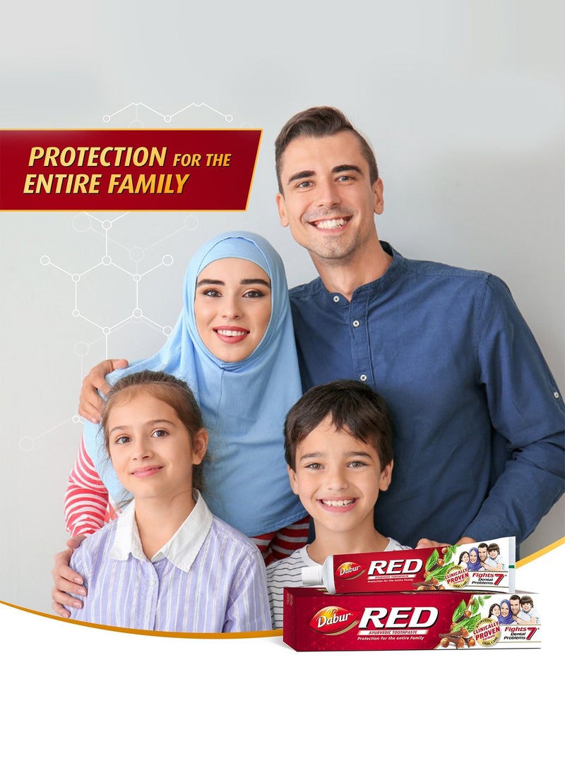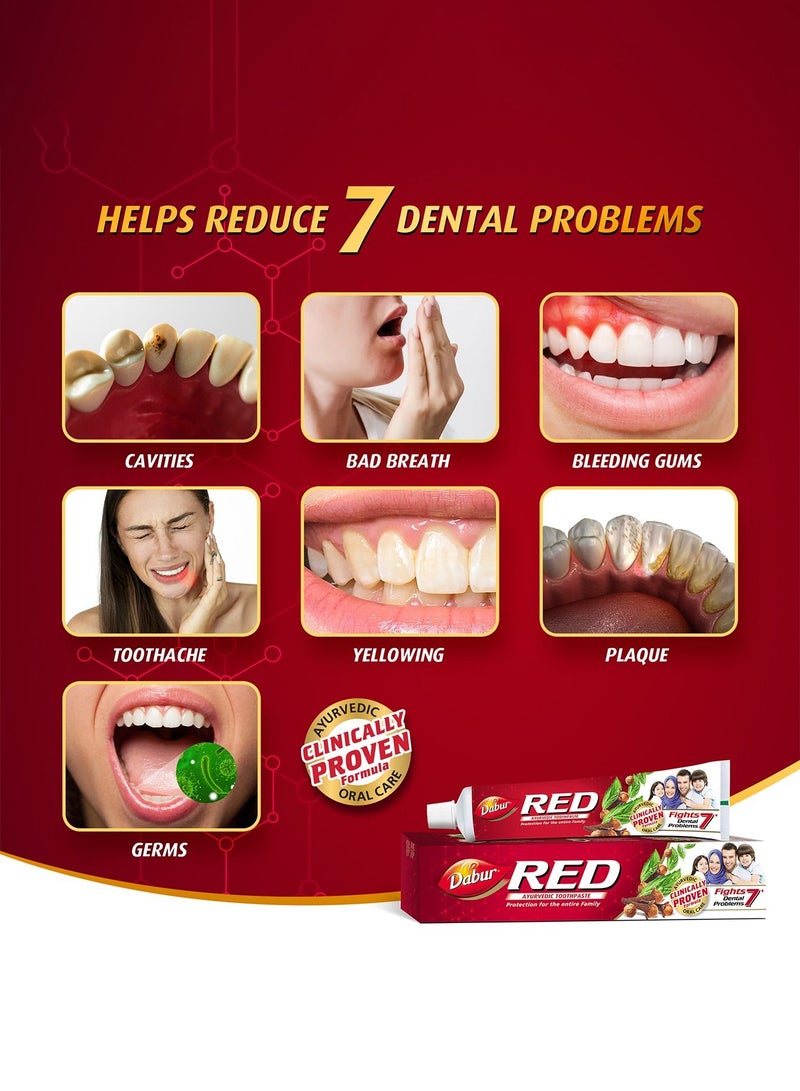 The Dabur Red Ayurvedic Toothpaste enriched with the goodness of Potent Ayurvedic Ingredients like Pudina, Laung, Shunti, and Tomar Beej helps maintain oral hygiene. These Natural ayurvedic extracts of Dabur Red Toothpaste helps you fight 7 Dental problems including Bleeding Gums, Cavities, Bad Breath, Toothache, Plaque, tooth decay and germs. Mint or Pudine helps teeth and gums fight off hazardous germs. Tomar seeds has antiseptic and odour fighting qualities. It is free from fluoride and harmful chemicals.