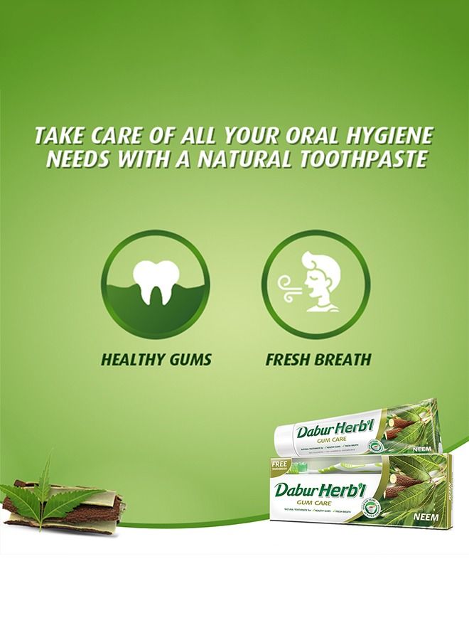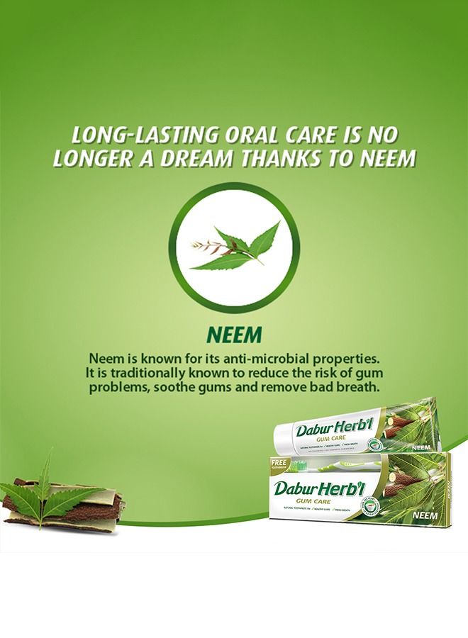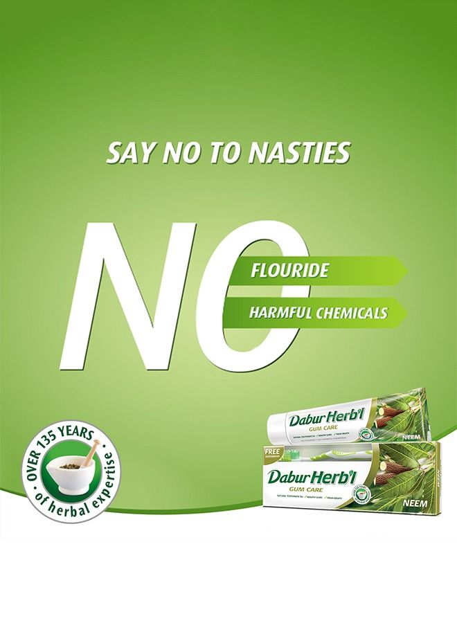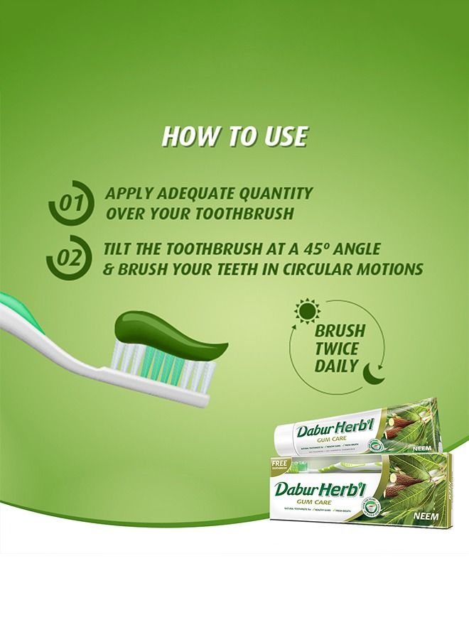 Dabur Herbal Neem Toothpaste is a Unique blend of Neem with natural calcium that helps ensure healthy and strong gums. The natural extracts of neem prevents your mouth from oral infections, bleeding and sore gums. The natural extract of neem helps cavities and bad breath. Regular brushing with Neem-containing toothpaste will reduce the deposition of plaque, prevents caries, and enhances the immune response for overall oral health. It is free from fluoride and harmful chemicals. The Neem Toothpaste comes with a Toothbrush as a compliment.