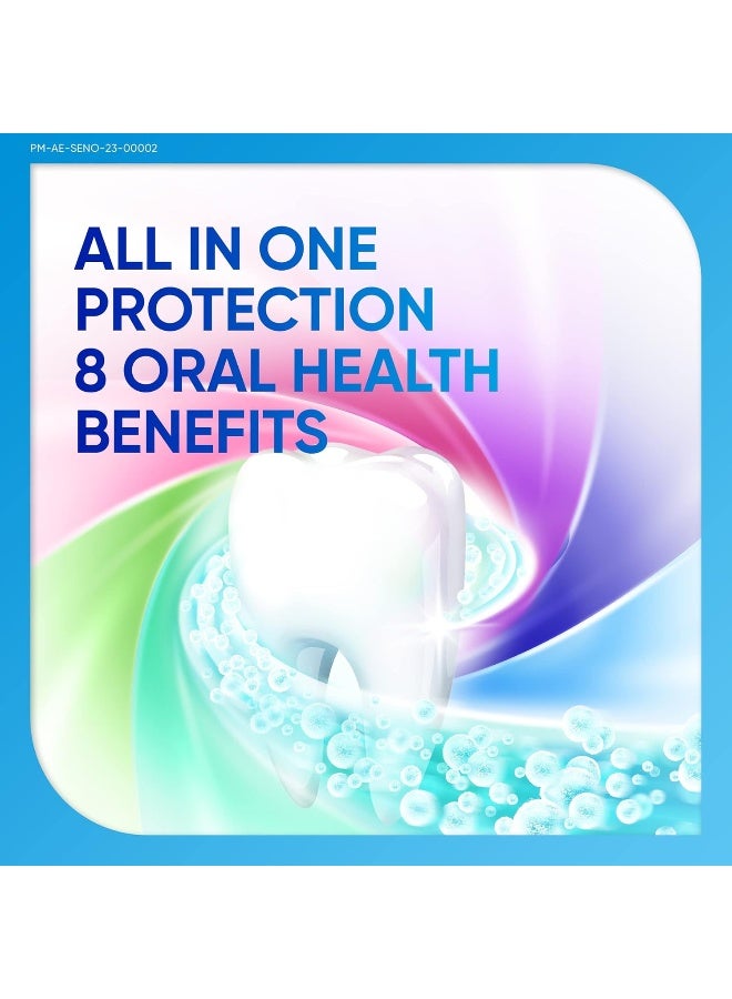 Sensodyne Advanced Complete Protection+ Advanced Whitening Toothpaste is designed for individuals with sensitive teeth. It offers multiple oral care benefits including sensitivity protection, cavity protection, enamel strengthening, gum health, plaque removal, and fresh breath. The toothpaste features an advanced cleaning system for superior cleaning action and advanced whitening for better whitening results. It has a refreshing minty taste infused with natural extracts. This toothpaste is suitable for daily use and is not recommended for children under 12 years of age.