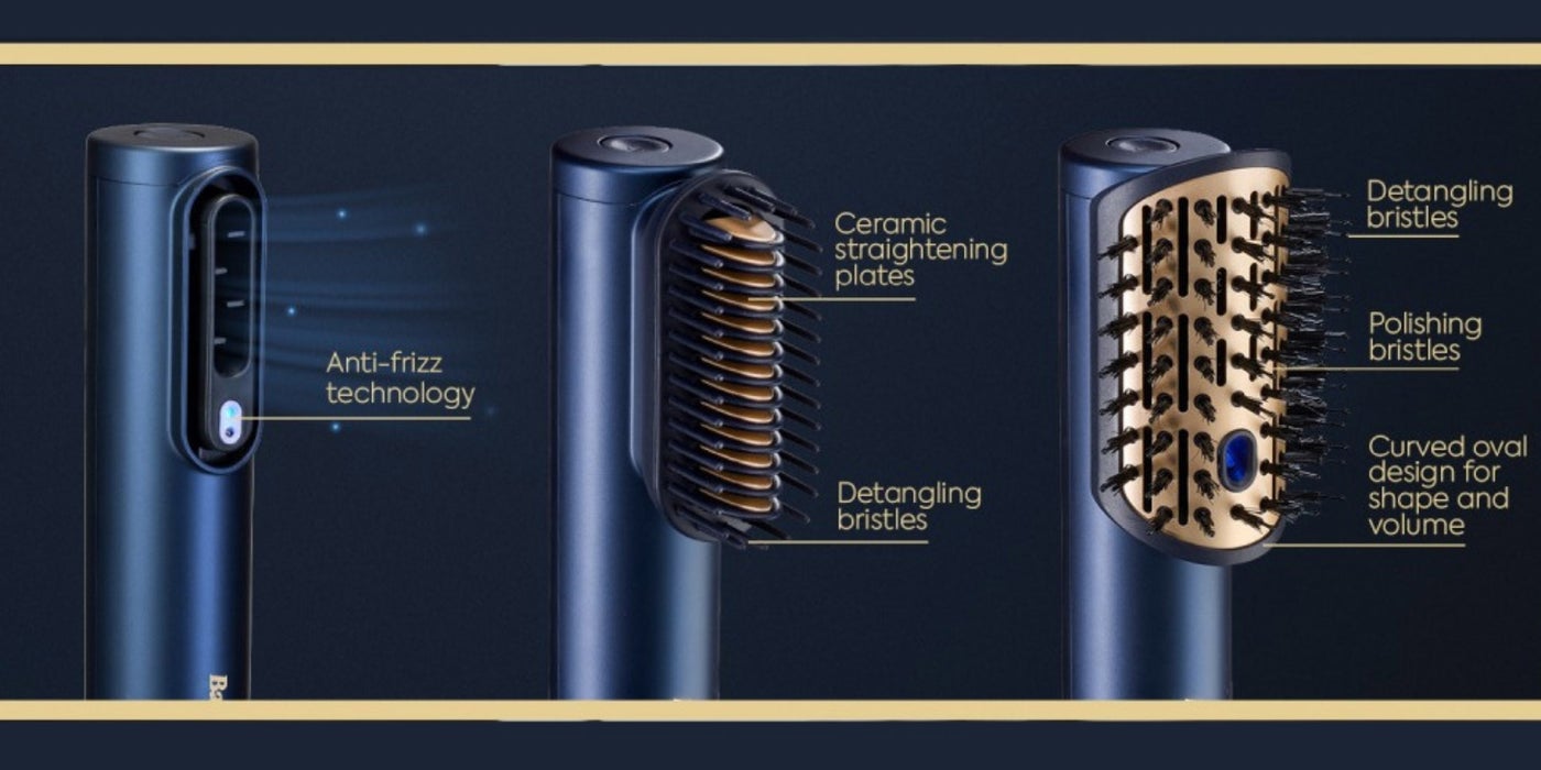 Three Interchangeable Ceramic-Coated Attachments: Includes a smoothing attachment for sleek results, a volume brush for lift and body, and a paddle brush for straightening and detangling