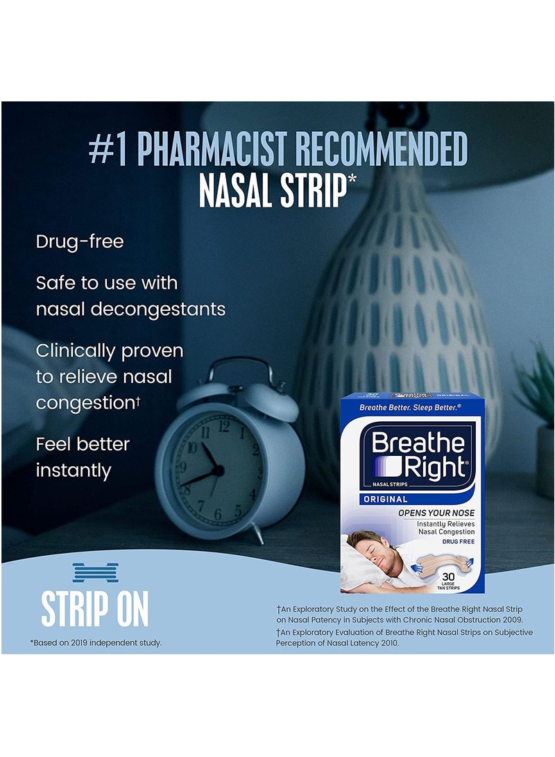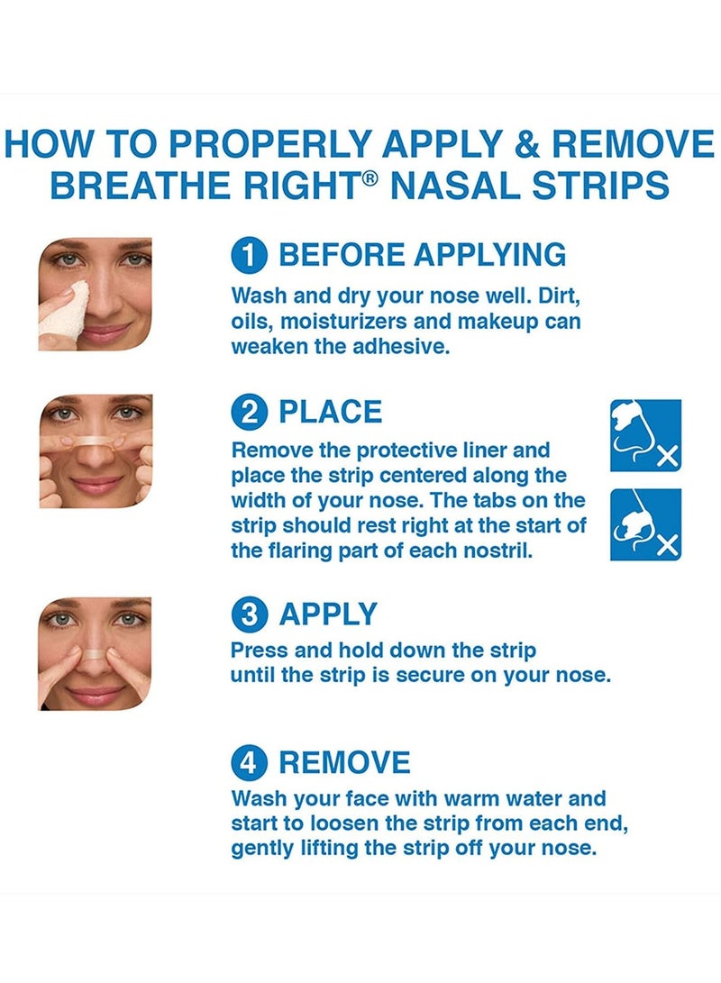 They seem simple but Breathe Right nasal strips have unique engineering that make them a sleeping aid as well as an effective tool for managing nighttime congestion and improving sleep. The nasal strips are made of flexible, spring-like bands that fit right above the flare of the nostrils. The underside is 3M adhesive so that once positioned on the nose, they stay there. As the bands attempt to straighten back to their original shape, they lift the sides of the nose and open the nasal passages. This lifting action helps open inflamed sinus passages and makes it easier to breathe. The nasal strips provide instant relief for congestion due to colds, allergies, or a deviated septum and reduce snoring caused by nighttime nasal congestion. How to use Breathe Right Nose Strips? Clean Your Face: Since adhesive doesn’t stick well to oily, wet or moisturized skin, it’s important to wash and thoroughly dry your nose before applying a nasal strip. Position Nasal Strip: Remove the protective liner to expose the adhesive, then position the nasal strip on your nose. Position is critical - the strip should be centered along the width of your nose with the tab on the flaring part of the nostril. The tabs shouldn’t cover the flaring part of the nostril entirely, but rather should sit just above. Apply to Nose: Gently rub the strip to secure it onto your nose. Nasal strips come in different sizes to fit different nose types, so you should determine which size is best for you. Also, it’s important to always refer to the packaging leaflet before use. Breathe Right nasal strips reduce or eliminate snoring and provide instant relief from nasal congestion due to colds, allergies and sinusitis, Breathe Right nasal strips are drug free. Breathe Right Nasal Strips patented dual flex bars gently pull open nasal passages so you can get more air.